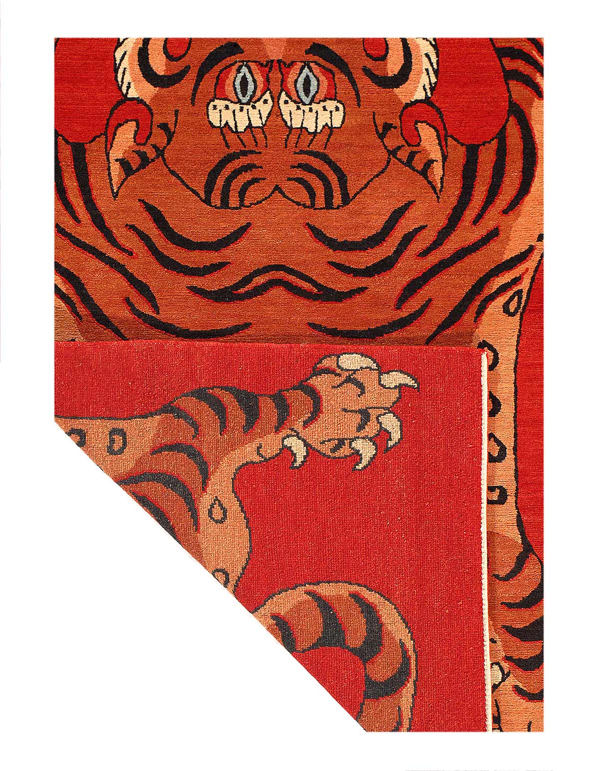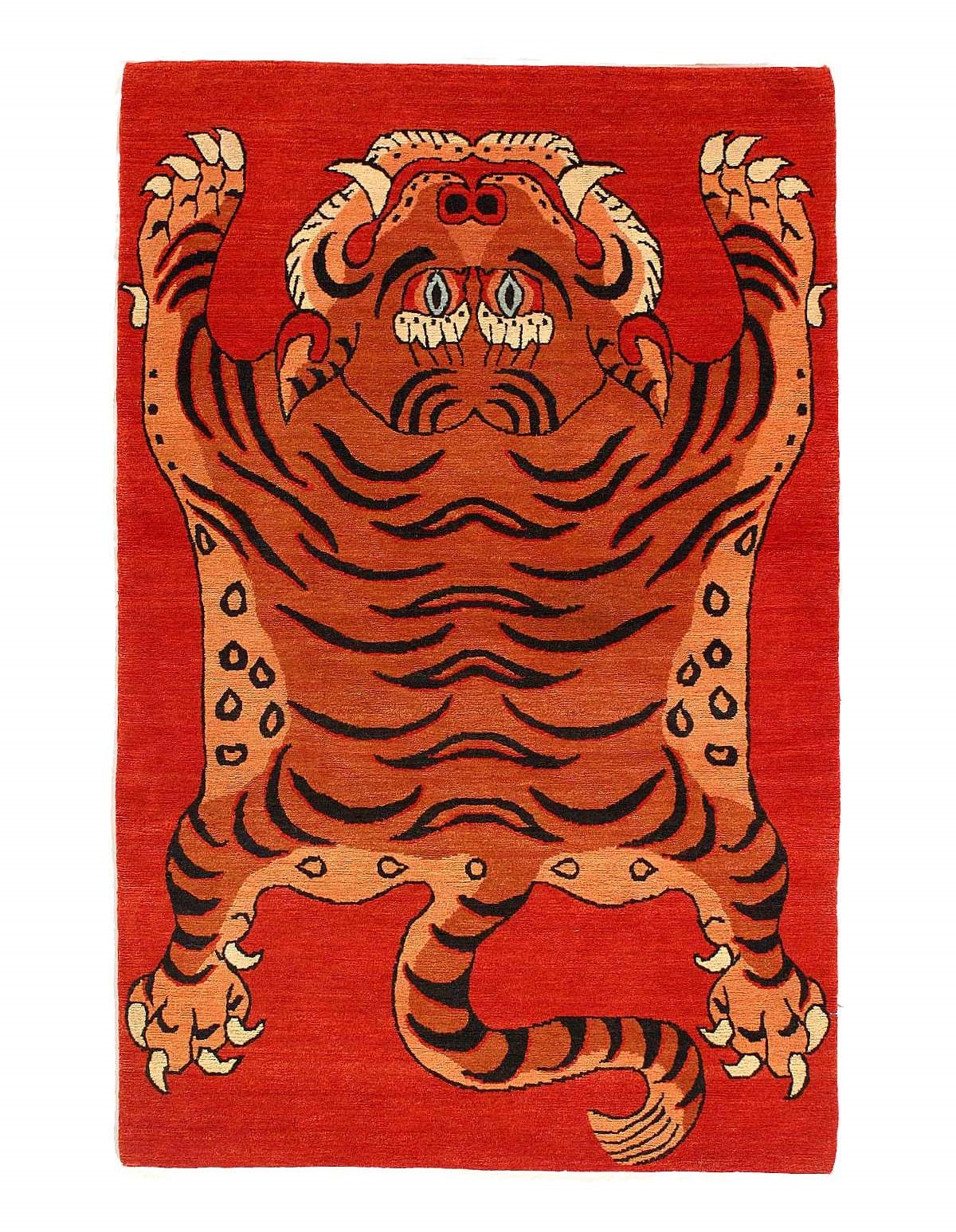 Modern Tibetan Tiger rugs, though named after their Tibetan origins, They are characterized by bold tiger motifs, often depicted in stylized or abstract forms, using vibrant colors like Red, black, white, and gold. These rugs are typically hand-knotted from high-quality wool, ensuring durability and a luxurious feel. The intricate patterns and high knot density contribute to their detailed designs and longevity. They come in various sizes and shapes, fitting diverse interior design needs.