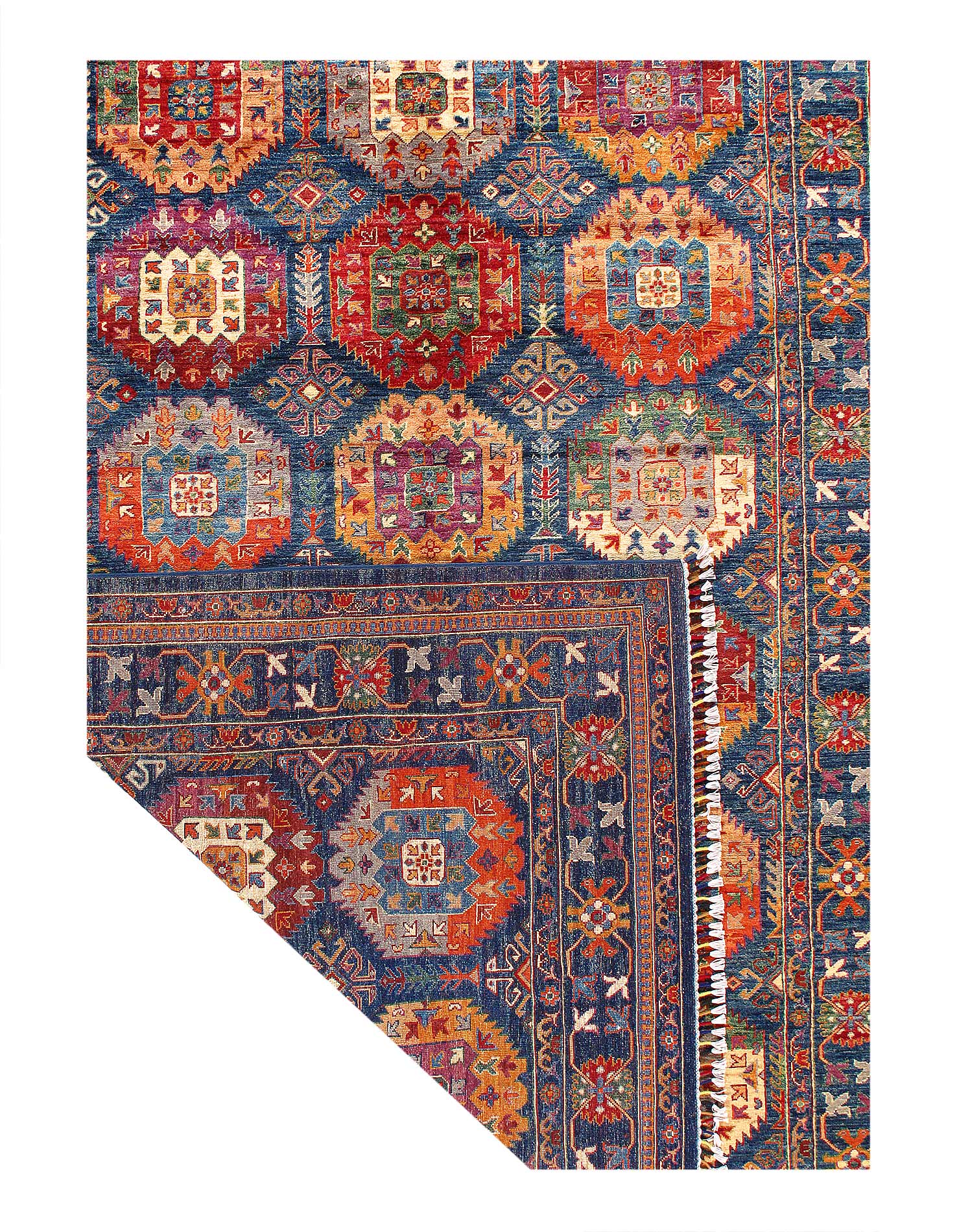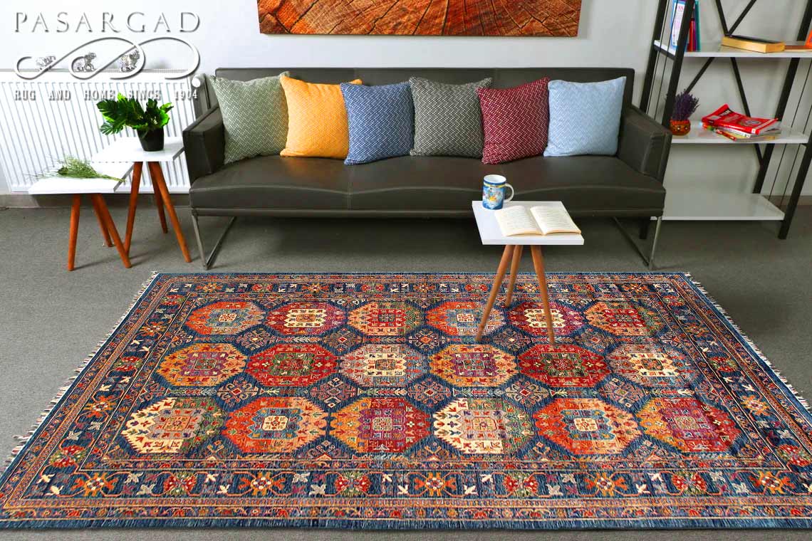 Turkman is a modern shape of old Caucasian rugs which strictly adheres to traditional design elements of the Caucasus. It has elements such as the stepped hooked polygons, geometrical medallions and rosettes, presented in more stylized manner and with a new dimension. Natural dyes produce soft luminous shades and abrashes causing a beautiful sheen. Handspun wool yarn is normally used in the variety of vibrant warm colors. Kazaks rugs in our collection are all fine quality pieces from Pakistan made with Ghazni handspun wool and natural dyes.