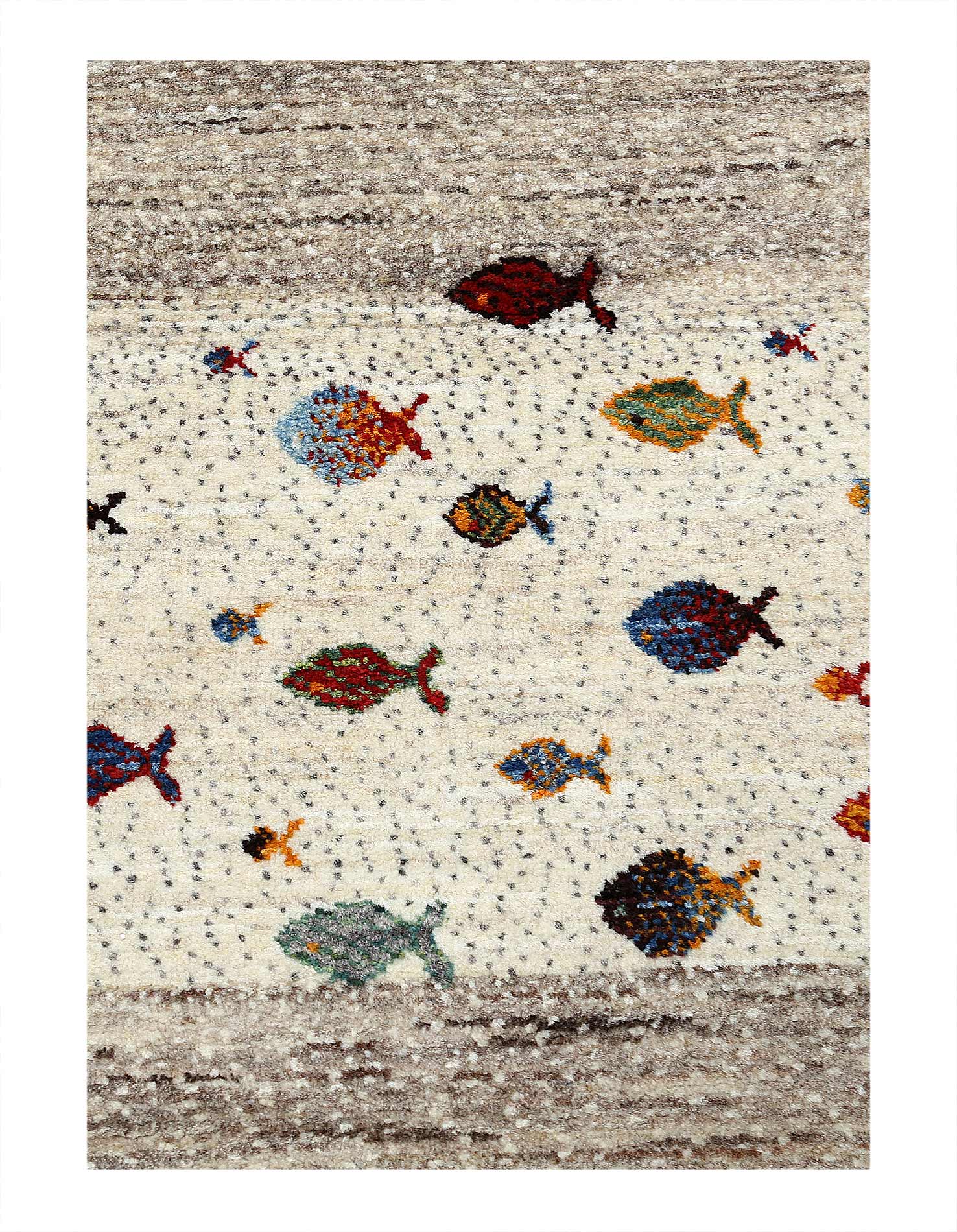 This beautiful rug is a Persian Gabbeh and thus belongs to the highest quality Gabbeh rugs. The rugs are knotted by nomads or semi-nomads in Iran following traditional handicraft. The simple motifs and patterns are mostly inspired by the nomads' close environment. For example camels, trees or bushes can be found on the traditional rugs. Persian Gabbeh rugs are made of wool from locally raised flocks of sheep. The wool is therefore mostly still spun by hand. Thus each of these oriental rugs embodies a unique character of centuries-old culture.