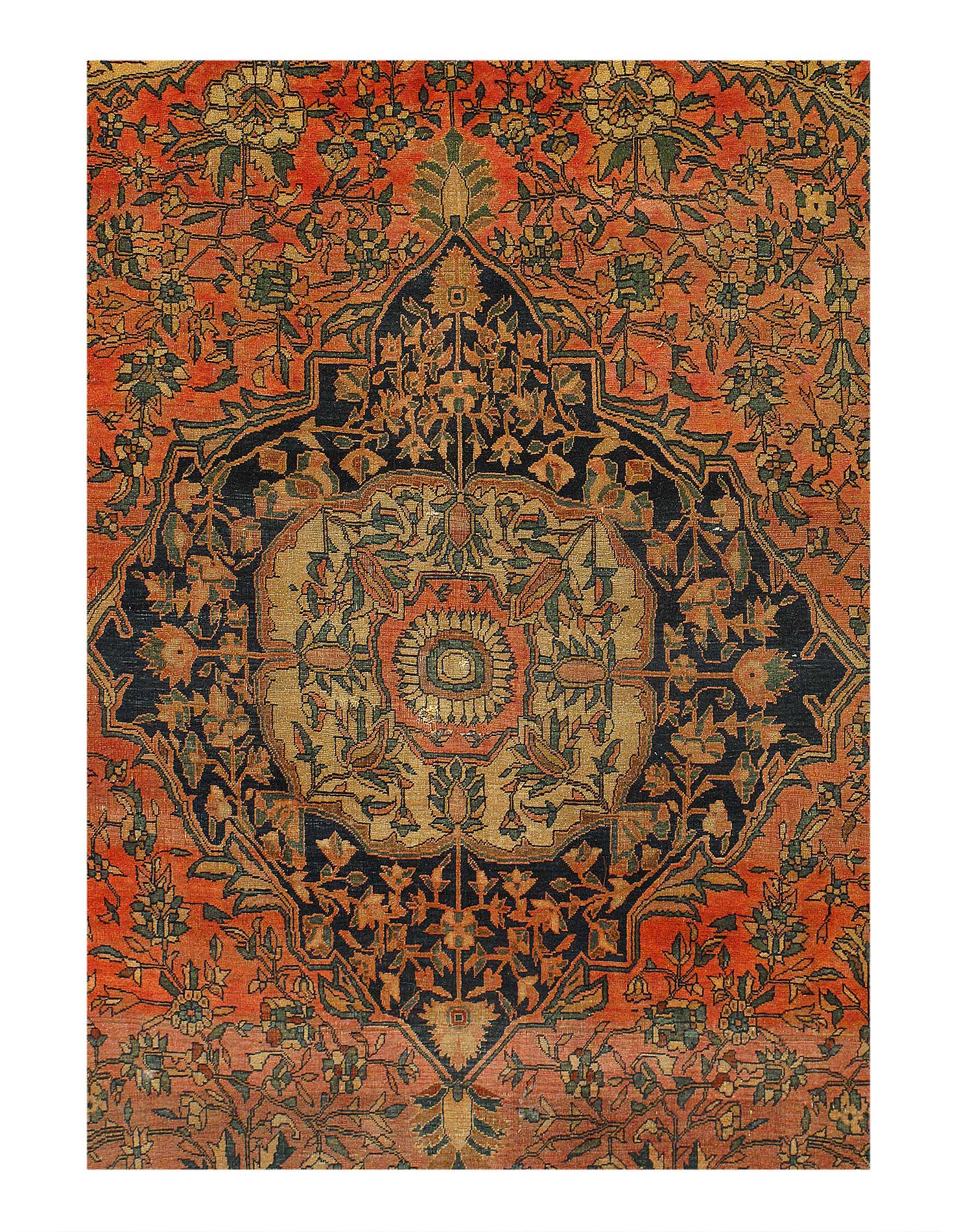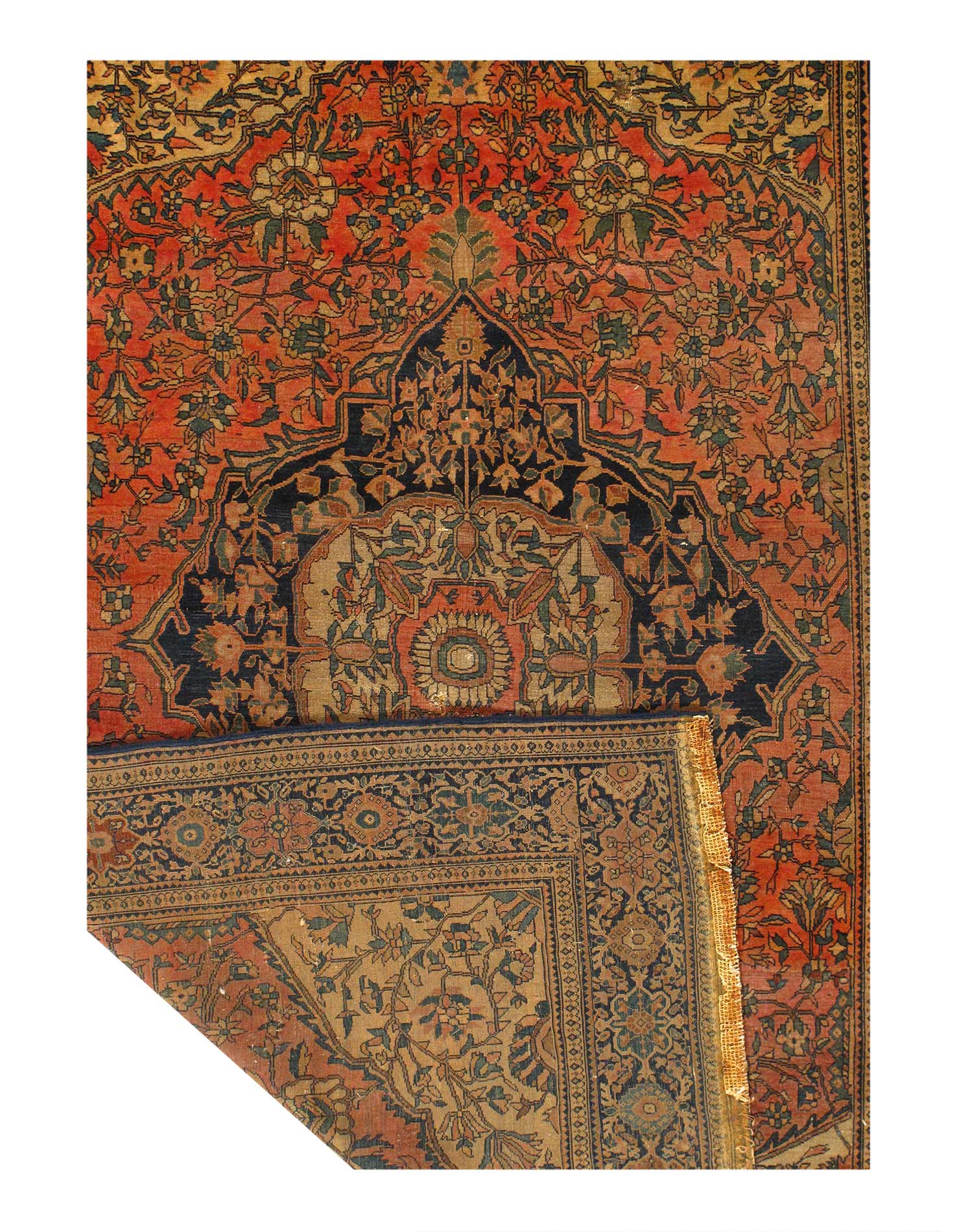 The central rug medallion design provides an organizational theme that echoes throughout the entire Persian rug. The border of the antique rug is understated as compared to the design of the field, highlighting the large-scale sweeping design of the central field.