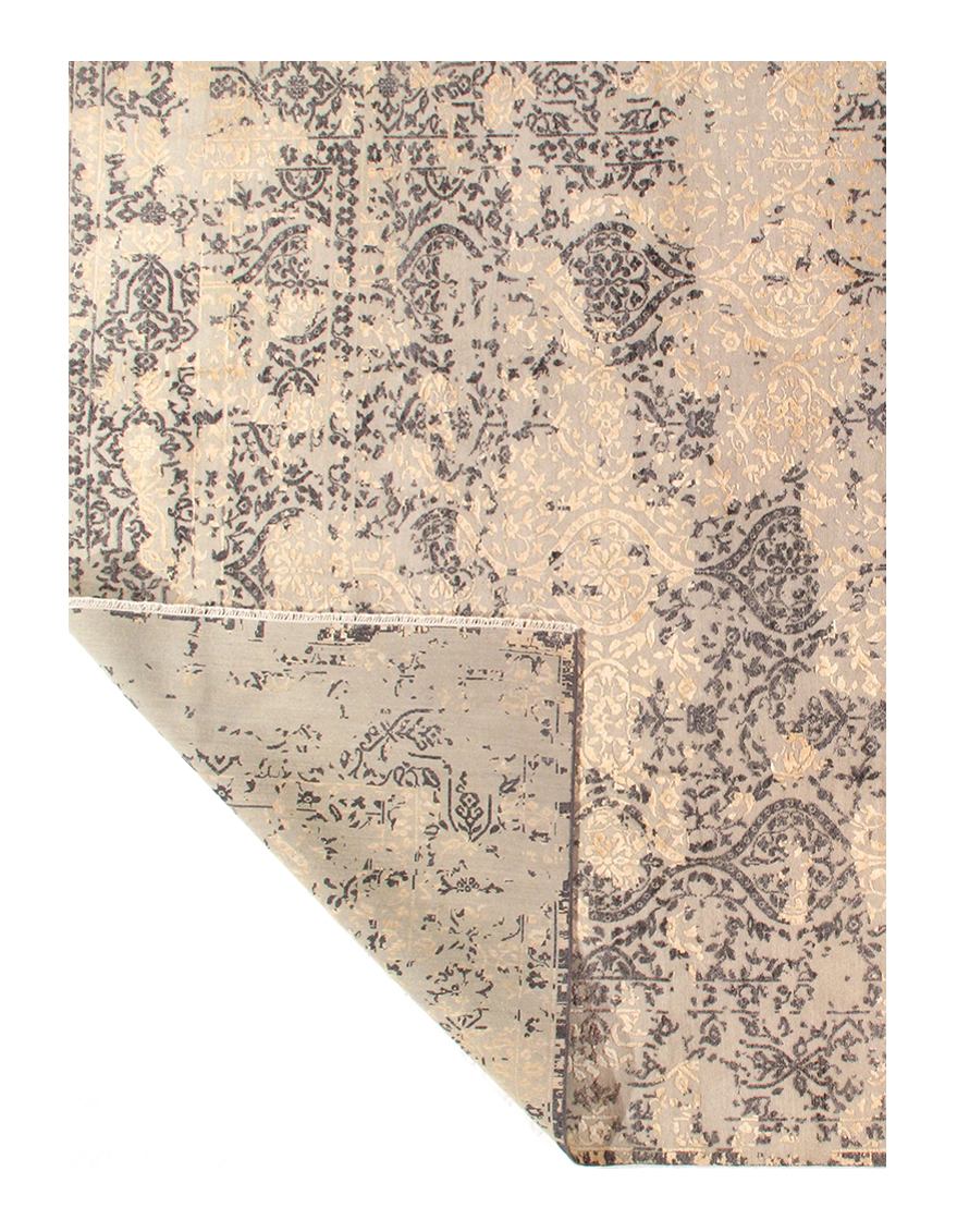 With its element of comfort, artistic statement and functional versatility, this contemporary rug will create a stunning focal point. Rather than sticking to a traditional modern style and risking a rather flat outcome, Indian artisans skillfully combined abstract style with the trending erased pattern creating this beautiful work of art. This balancing effect of modern abstract design with cool colors and subtle luminosity from the silky shimmers evoke the interior ornamental detail and coloration throughout and contrast beautifully with the overall design. Sporting a simple yet effortlessly sophisticated look, this contemporary style rug is very versatile. With its show-stopping ‘Erased’ antique style and luxurious blend of modernism and abstract design, this rug will work well with transitional, modern and contemporary interiors. Hand-knotted wool and bamboo silk. Made in India.
