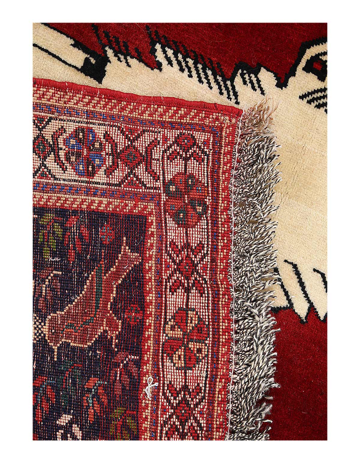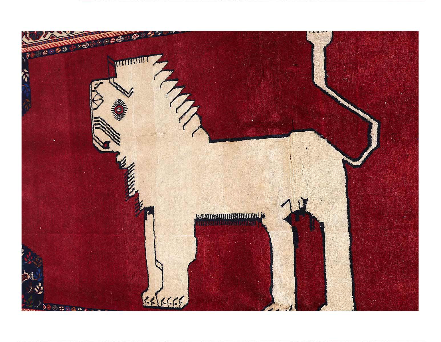 This Persian Qashqai Lion carpet features a Kashkouli style weave. Highlighting the powerful imagery of a prowling Lion, the carpet's central motif features a cream lion atop a rich red background. Utilizing the contrasting hues between the light cream background, weavers designated the alternating tones to depict depth and detailing for the lion's mane, paws, ears, and tail. Furthermore, the eye of the lion and torso detailing, completed in dark indigo, adds character to the lion. Surrounding the big cat is a simple and colorful border featuring tribal and a repetitive dogtooth border. Adding life to the geometric cream wool detail the exterior with dark gray outlining each motif. Considering this Qashqai's unique design, what truly separates this carpet from other transitional pieces comes down to its hand-knotted construction.