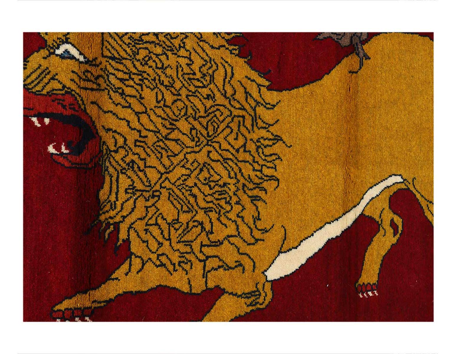 This Persian Qashqai Lion carpet features a Kashkouli style weave. Highlighting the powerful imagery of a prowling Lion, the carpet's central motif features a cream lion atop a rich red background. Utilizing the contrasting hues between the light cream background, weavers designated the alternating tones to depict depth and detailing for the lion's mane, paws, ears, and tail. Furthermore, the eye of the lion and torso detailing, completed in dark indigo, adds character to the lion. Surrounding the big cat is a simple and colorful border featuring tribal and a repetitive dogtooth border. Adding life to the geometric cream wool detail the exterior with dark gray outlining each motif. Considering this Qashqai's unique design, what truly separates this carpet from other transitional pieces comes down to its hand-knotted construction.