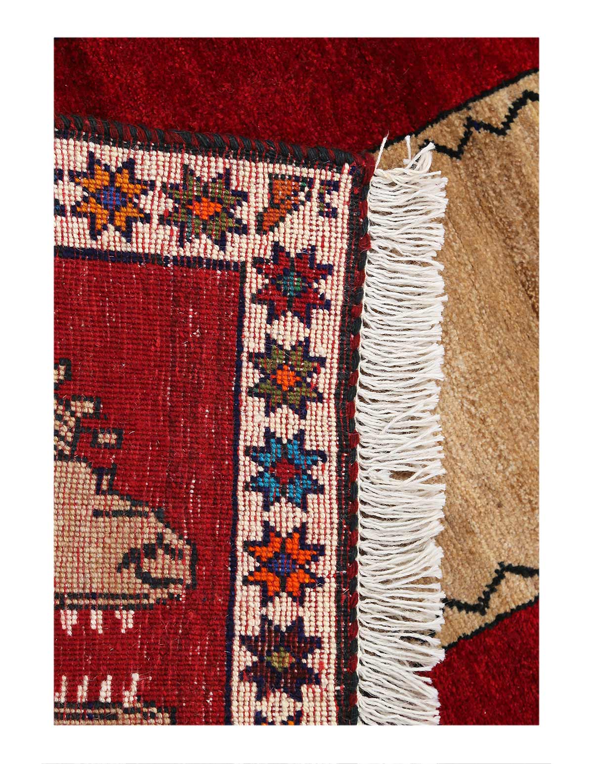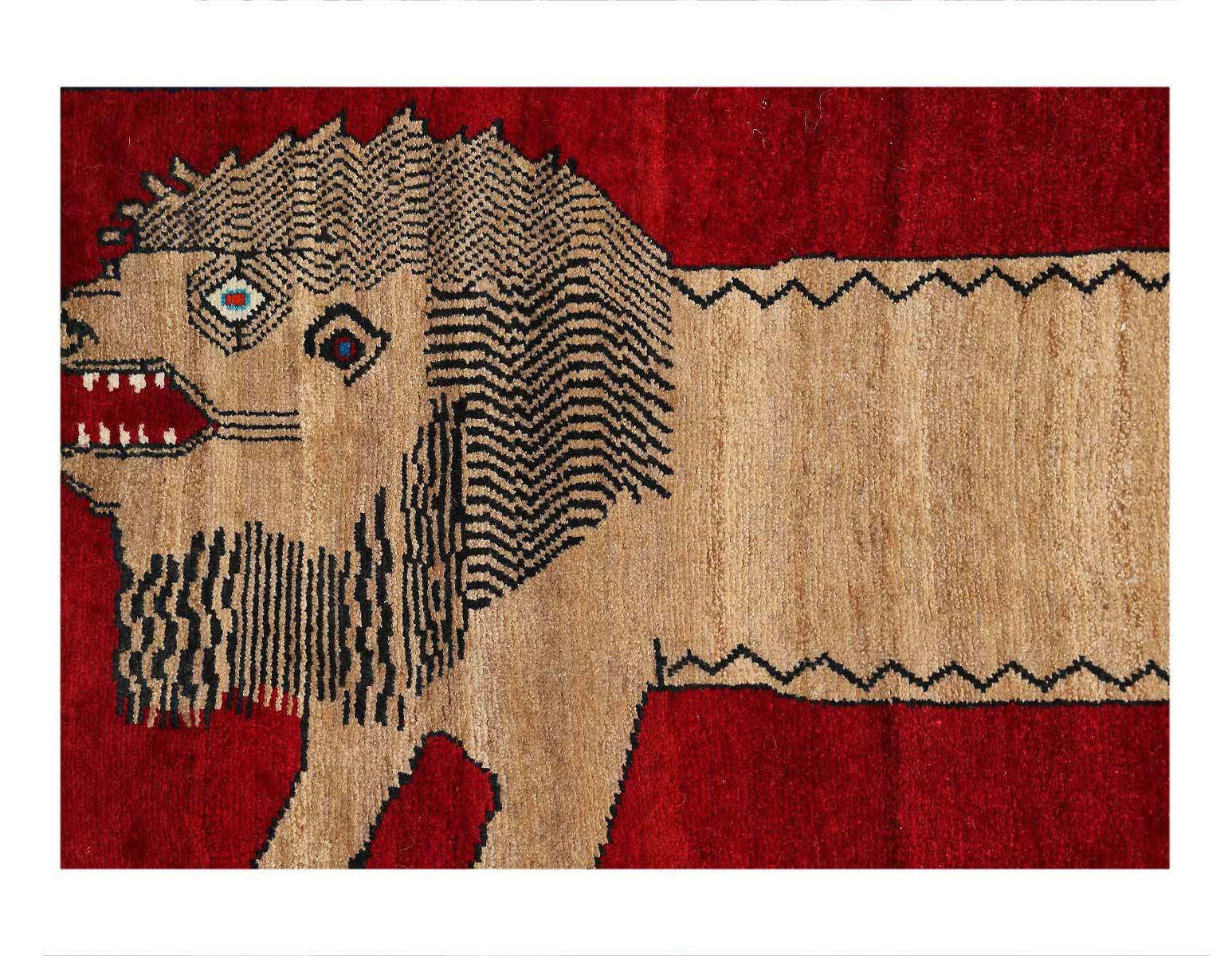 This Persian Qashqai Lion carpet features a Kashkouli style weave. Highlighting the powerful imagery of a prowling Lion, the carpet's central motif features a cream lion atop a rich red background. Utilizing the contrasting hues between the light cream background, weavers designated the alternating tones to depict depth and detailing for the lion's mane, paws, ears, and tail. Furthermore, the eye of the lion and torso detailing, completed in dark indigo, adds character to the lion. Surrounding the big cat is a simple and colorful border featuring tribal and a repetitive dogtooth border. Adding life to the geometric cream wool detail the exterior with dark gray outlining each motif. Considering this Qashqai's unique design, what truly separates this carpet from other transitional pieces comes down to its hand-knotted construction.