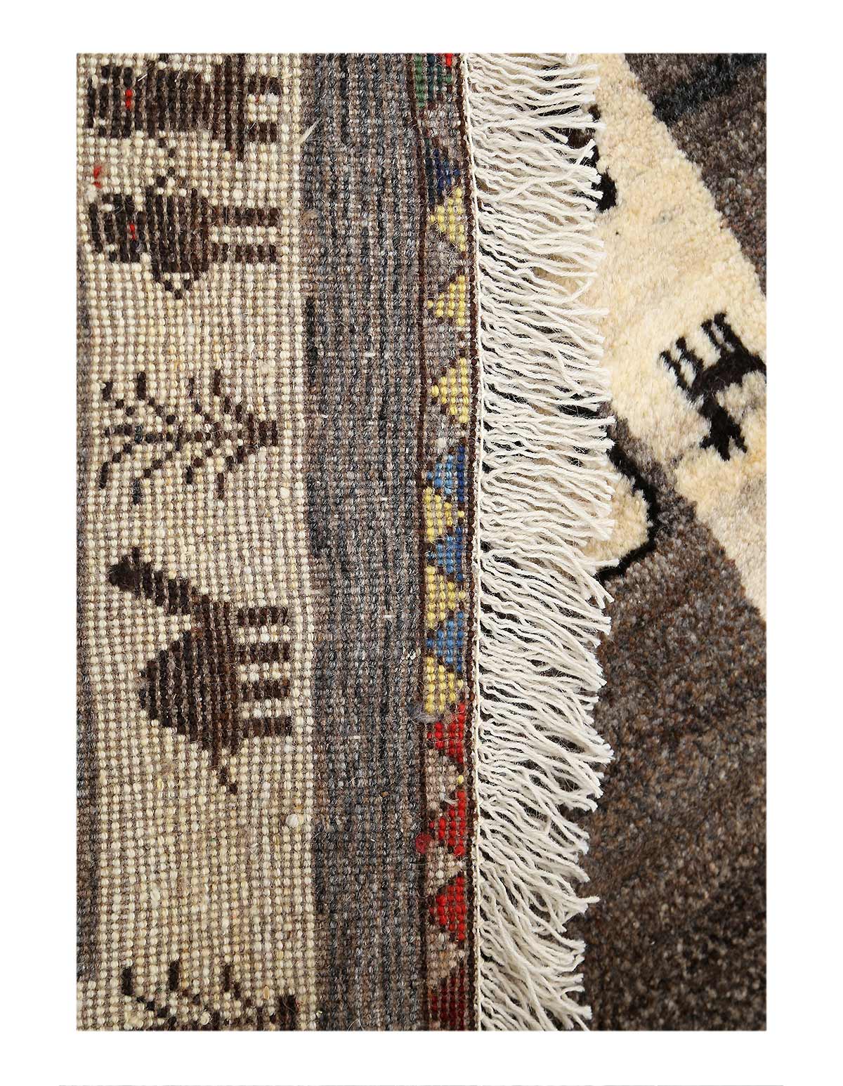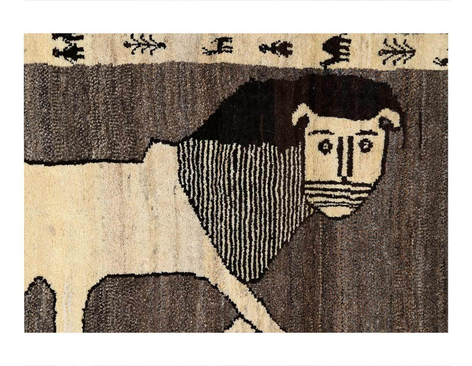 This Persian Qashqai Lion carpet features a Kashkouli style weave. Highlighting the powerful imagery of a prowling Lion, the carpet's central motif features a cream lion atop a rich red background. Utilizing the contrasting hues between the light cream background, weavers designated the alternating tones to depict depth and detailing for the lion's mane, paws, ears, and tail. Furthermore, the eye of the lion and torso detailing, completed in dark indigo, adds character to the lion. Surrounding the big cat is a simple and colorful border featuring tribal and a repetitive dogtooth border. Adding life to the geometric cream wool detail the exterior with dark gray outlining each motif. Considering this Qashqai's unique design, what truly separates this carpet from other transitional pieces comes down to its hand-knotted construction.