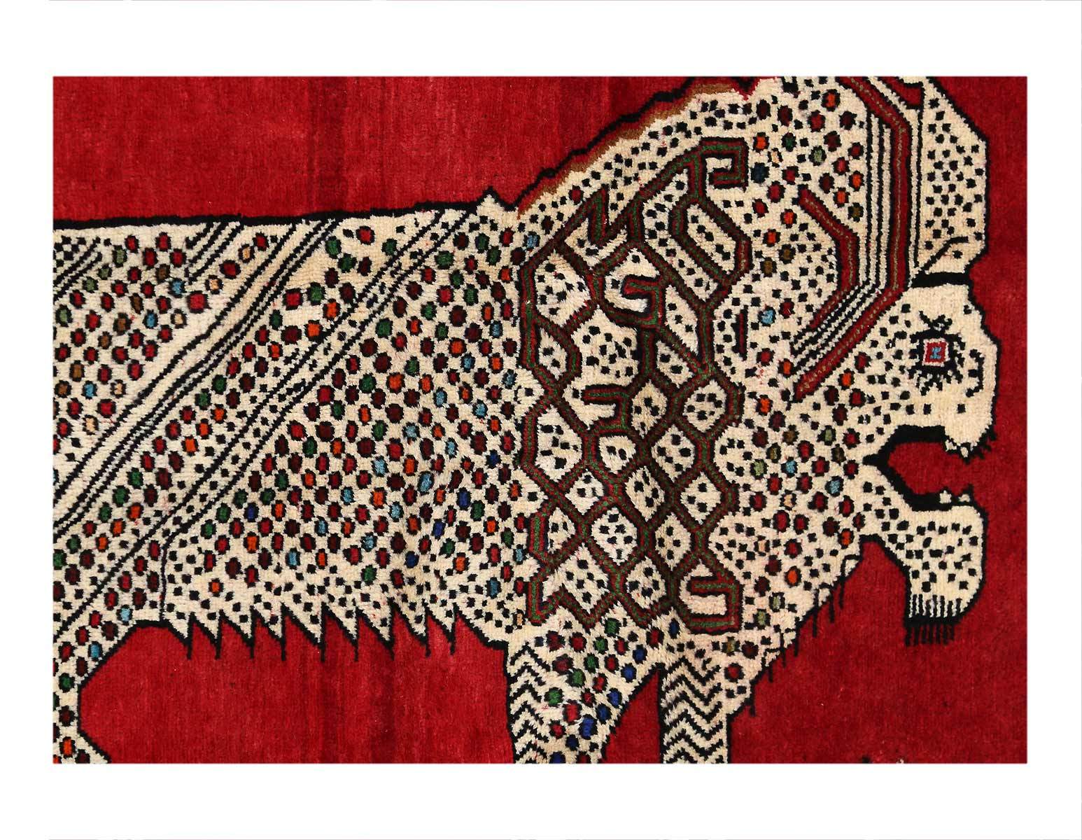 This Persian Qashqai Lion carpet features a Kashkouli style weave. Highlighting the powerful imagery of a prowling Lion, the carpet's central motif features a cream lion atop a rich red background. Utilizing the contrasting hues between the light cream background, weavers designated the alternating tones to depict depth and detailing for the lion's mane, paws, ears, and tail. Furthermore, the eye of the lion and torso detailing, completed in dark indigo, adds character to the lion. Surrounding the big cat is a simple and colorful border featuring tribal and a repetitive dogtooth border. Adding life to the geometric cream wool detail the exterior with dark gray outlining each motif. Considering this Qashqai's unique design, what truly separates this carpet from other transitional pieces comes down to its hand-knotted construction.