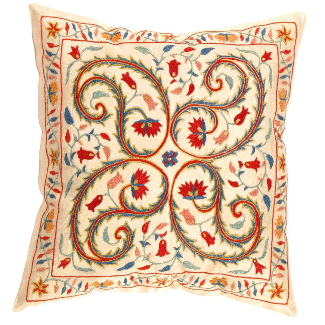 ● True to the “needle” origin of the Persian word suzani, these pillows are embroidered with traditional floral motifs in richly coloured patterns that define this historic style.