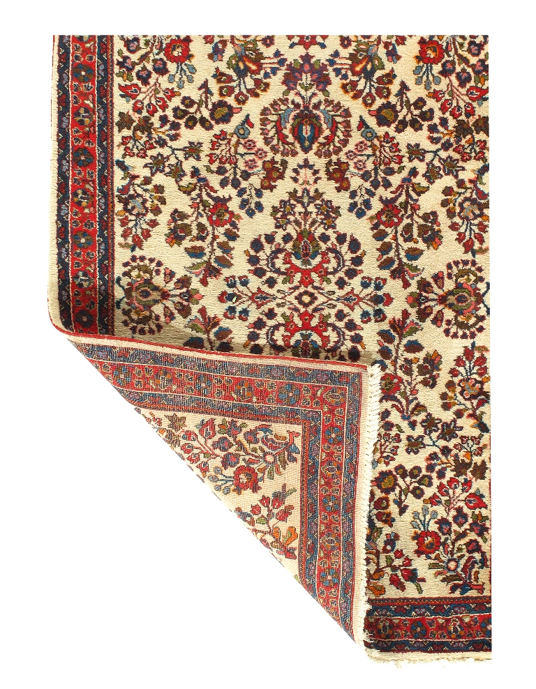 Palmettes, flowers, and sinuous vines wend their way in profusion across the rich red field of this luscious antique Sarouk. The design is carefully controlled in its layout and symmetry despite its dynamic freedom and exuberance. The field elements reappear in the main border as a continuous vinescroll, but set against a blue ground in framing contrast to the field. The meticulous drawing and uniform design texture create a harmonious decorative effect despite the richness of the color and complexity of the ornament.