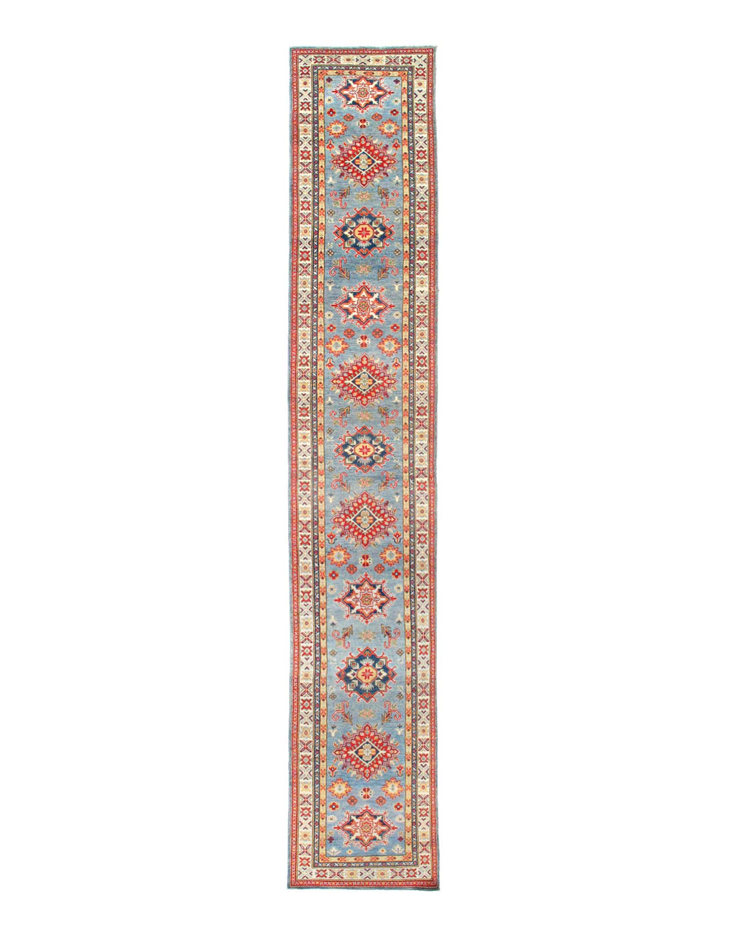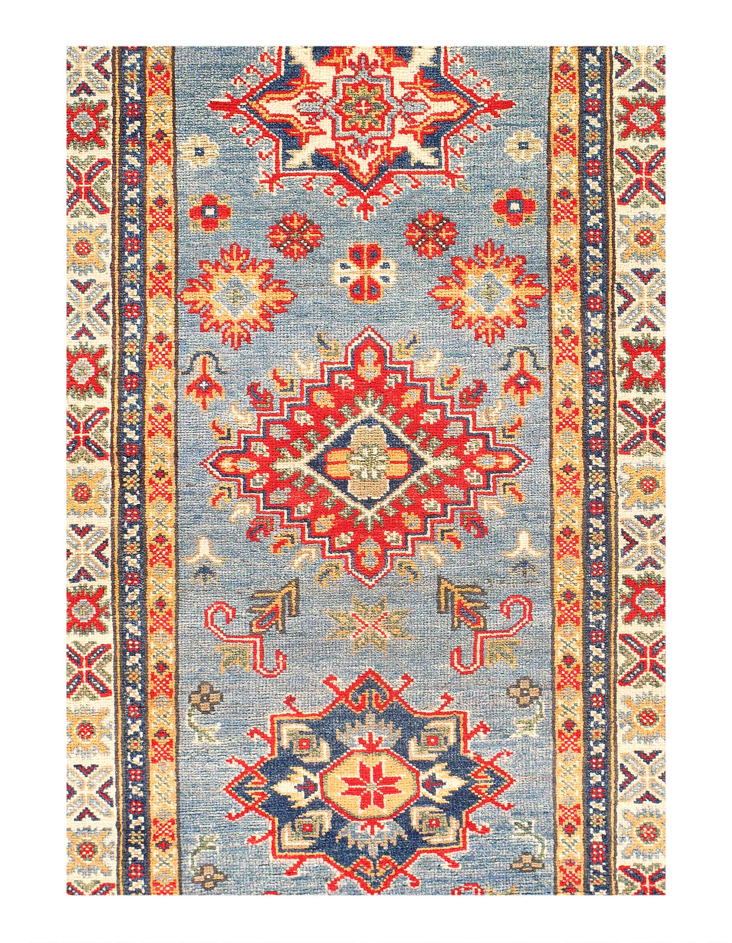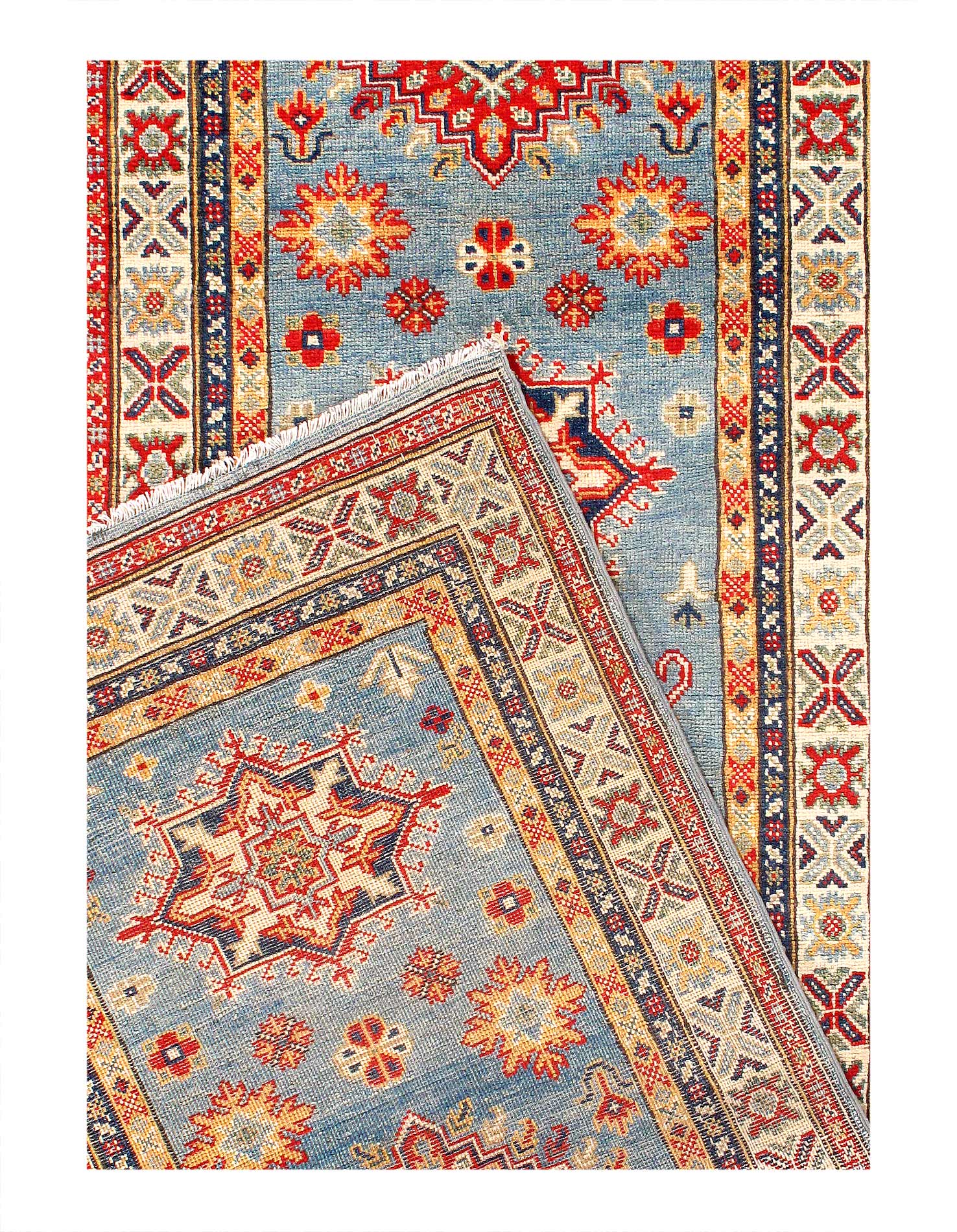 Vegetable Dyed,This rug is handmade from 100-percent premium, hand-spun wool, and employ ancient pot-dying techniques to give them their authentic look.This rug is handmade from 100-percent premium, hand-spun wool, and employ ancient pot-dying techniques to give them their authentic look.Kazak is a modern shape of old Caucasian rugs which strictly adheres to traditional design elements of the Caucasus. It has elements such as the stepped hooked polygons, geometrical medallions and rosettes, presented in more stylized manner and with a new dimension. Natural dyes produce soft luminous shades and abrashes causing a beautiful sheen. Hand spun wool yarn is normally used in the variety of vibrant warm colors. Kazaks rugs in our collection are all fine quality pieces from Pakistan made with Ghazni handspun wool and natural dyes.