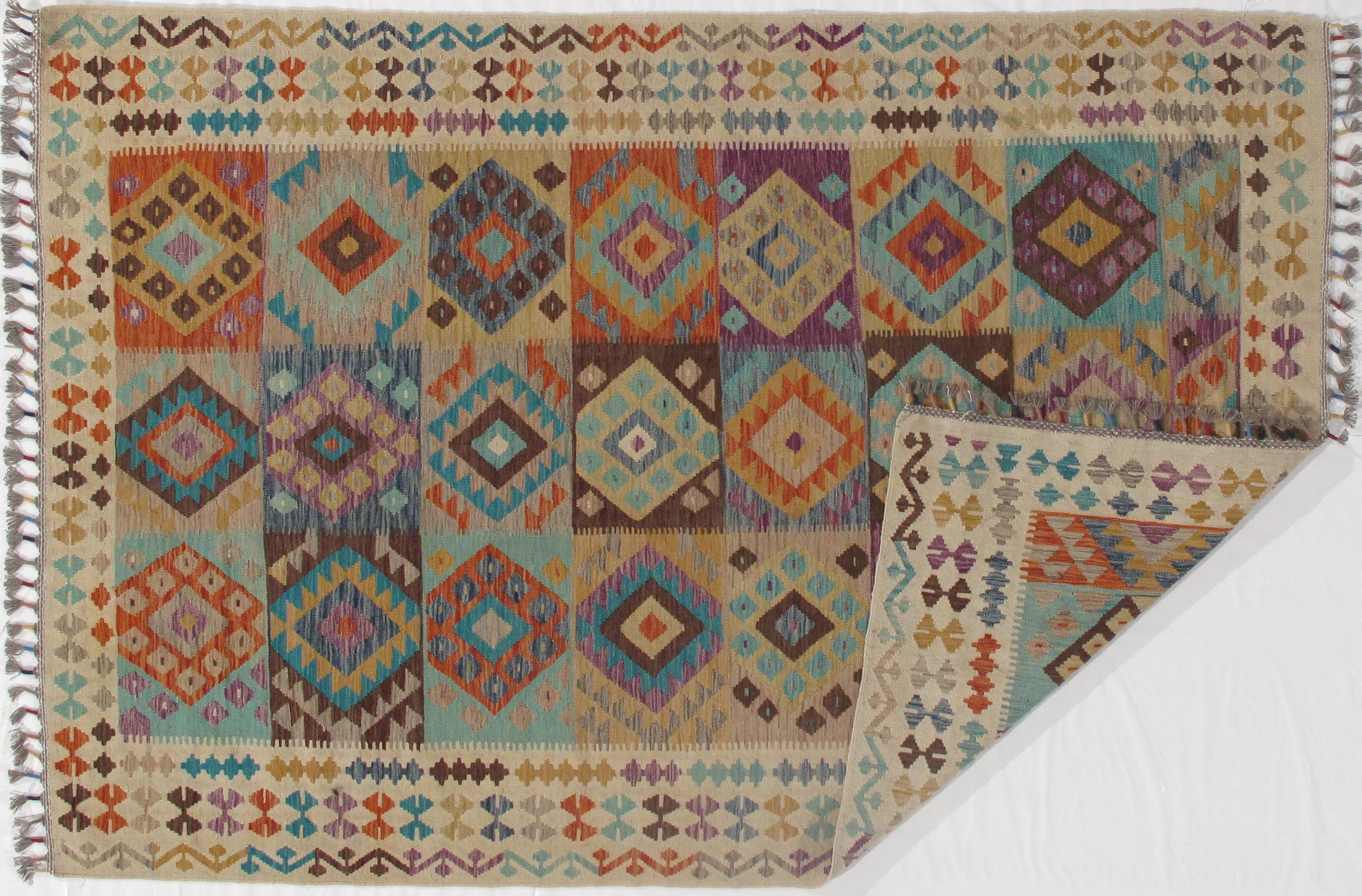 Add a touch of elegance to your home with this casual chic hand woven Kilim wool rug. Constructed on a loom by Nomad turkman people with hand spun wool and 100% natural Vegetable dyes this beautiful rug is known for its beautiful repetitive geometric pattern with naturalistic floral and traditional patterns. The contemporary fashion palette produces bold, sharp patterns that are ingeniously versatile as the pattern is same on the front and back. This double-sided rug is designed to be used both ways being one side has a light shade of color, rather the other side has brighter colors and can be used to preference. This beautiful rug is made by individual short strands of different color being knotted onto the warps and held together by pressing the wefts tightly. The design is made by interweaving the variously colored wefts and warps. Kilims are known to be one of a kind rug due to its durability and versatility.