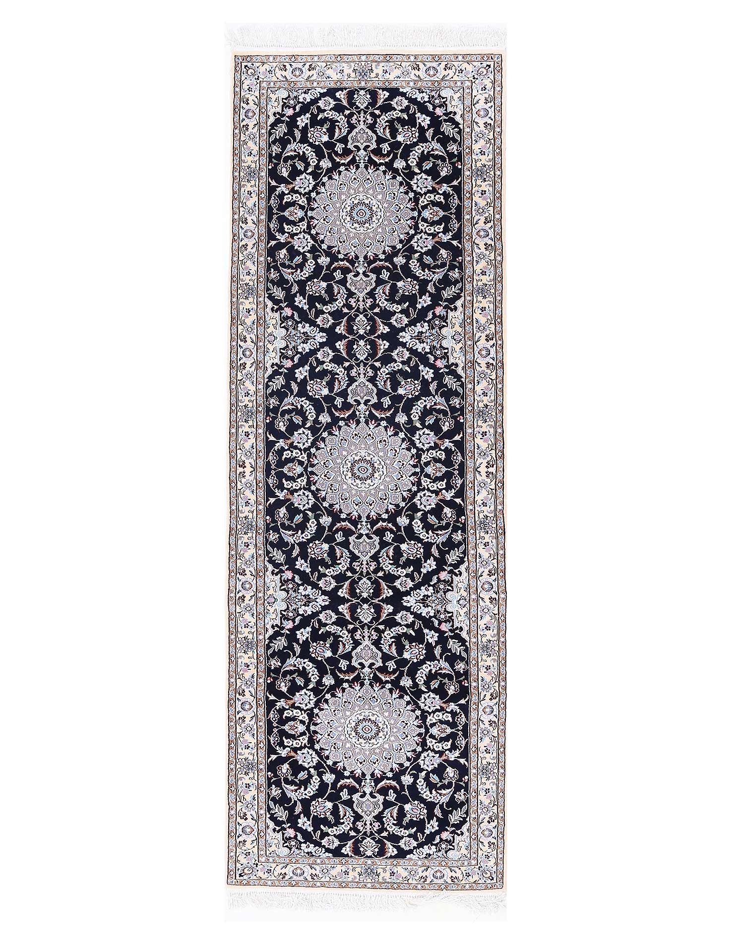 Persian Nain rugs are renowned for their detail and fine use of outlining along the central motifs. Breaking from the classical style of many vintage rugs produced around central Iran, Persian Nain rugs became renowned for their modern appeal and personal style, establishing the classical motifs of many other regional rugs, only through a more precise lens. In this striking piece, the precision is particularly visible along the heart of the vintage Persian rug, where the attention to detail allows each individual color to stand out as a unique part of the whole. The surrounding borders help ground the masterpiece and add horizontal intrigue to the natural elements within, which are arranged vertically to establish a cascading effect.