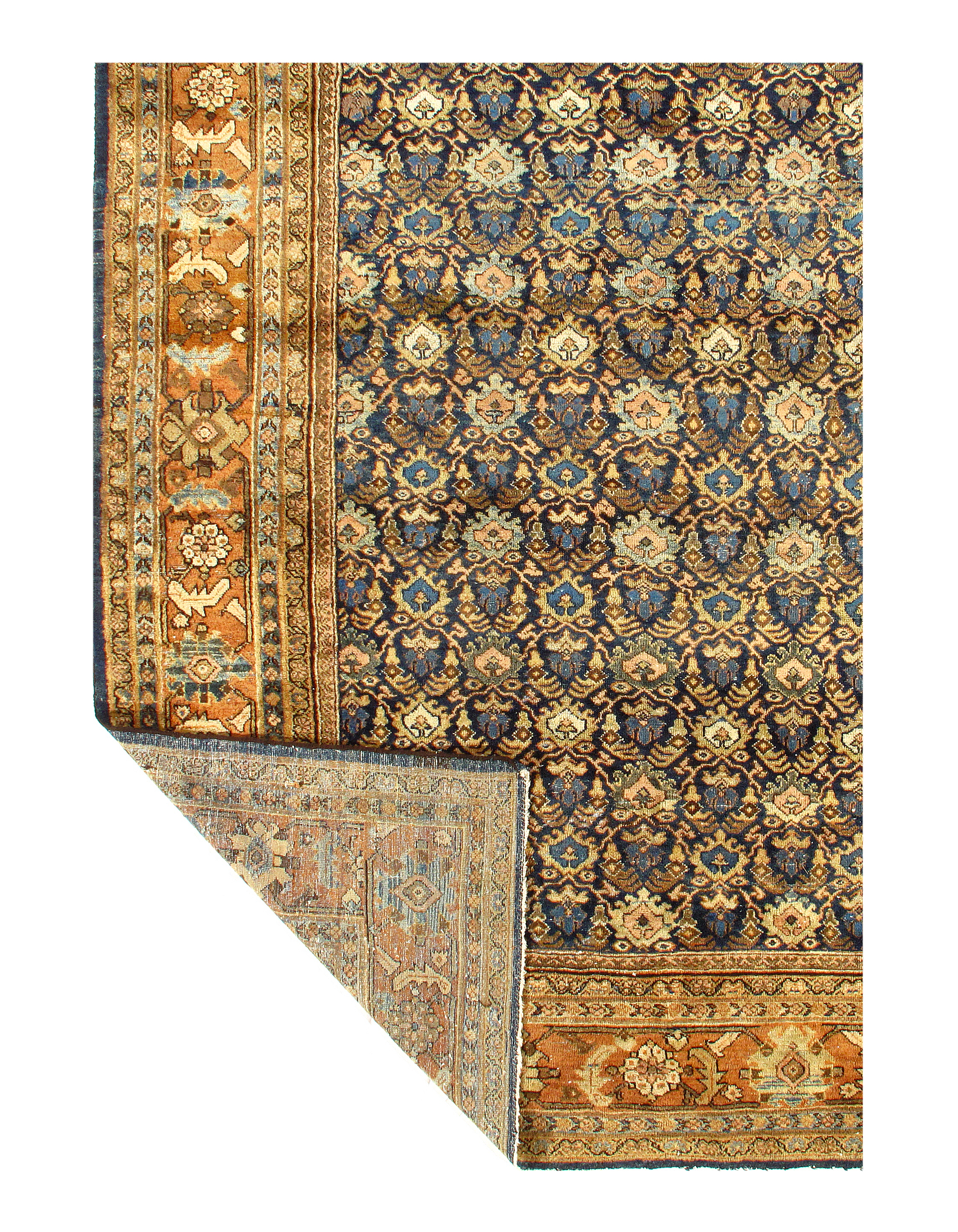 Often the finest in the antique Mahal style of antique rugs render spacious, very unique variations upon classical Persian allover antique carpet patterns, such as the Herati (repeated diamond and curling leaf), the Mina Khani (repeated circular flowerhead) and Harshang (highly stylized dragon and blossom), often in subtle, glowing pastels and earth tones. Many Mahals utilize these allover motifs, while others present the central medallion format, seen often in other Persian carpet styles.