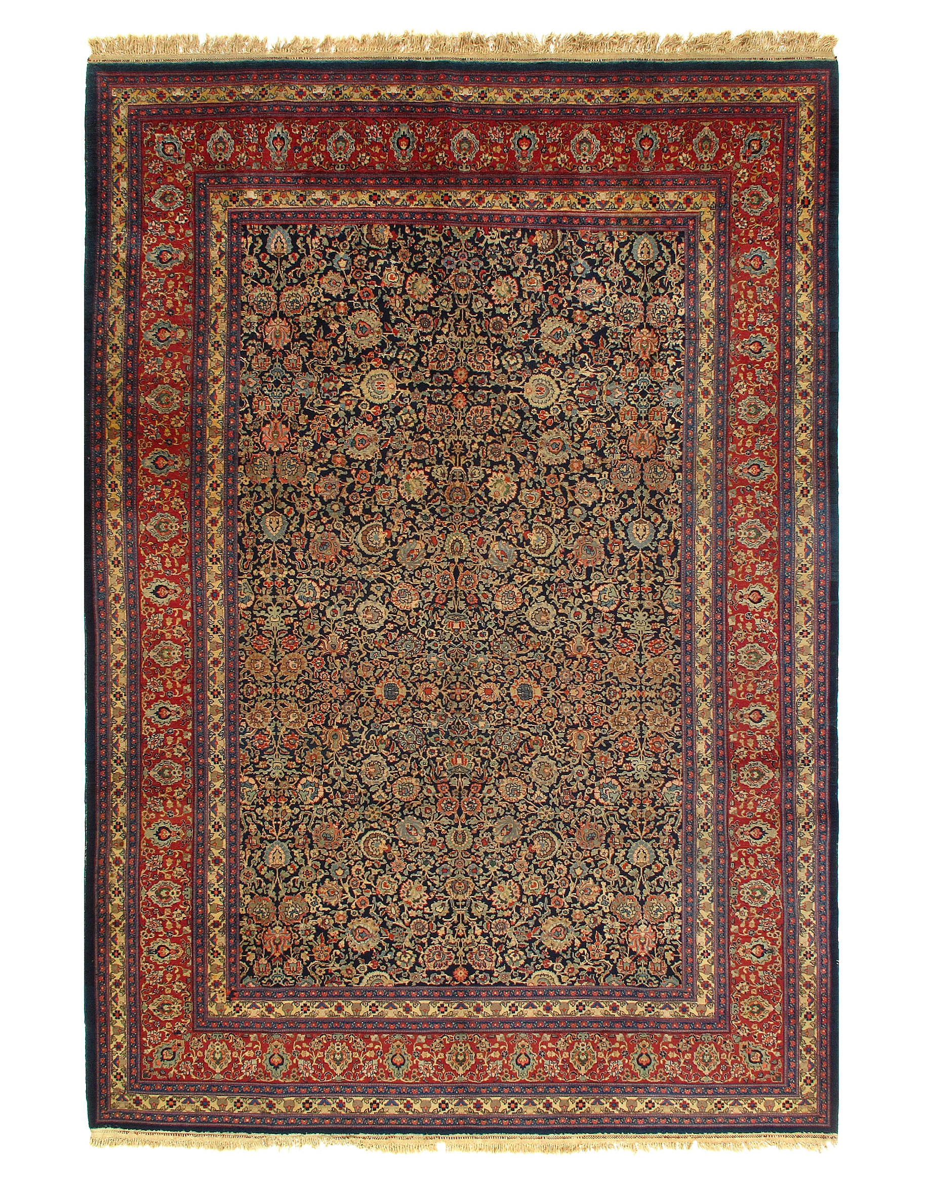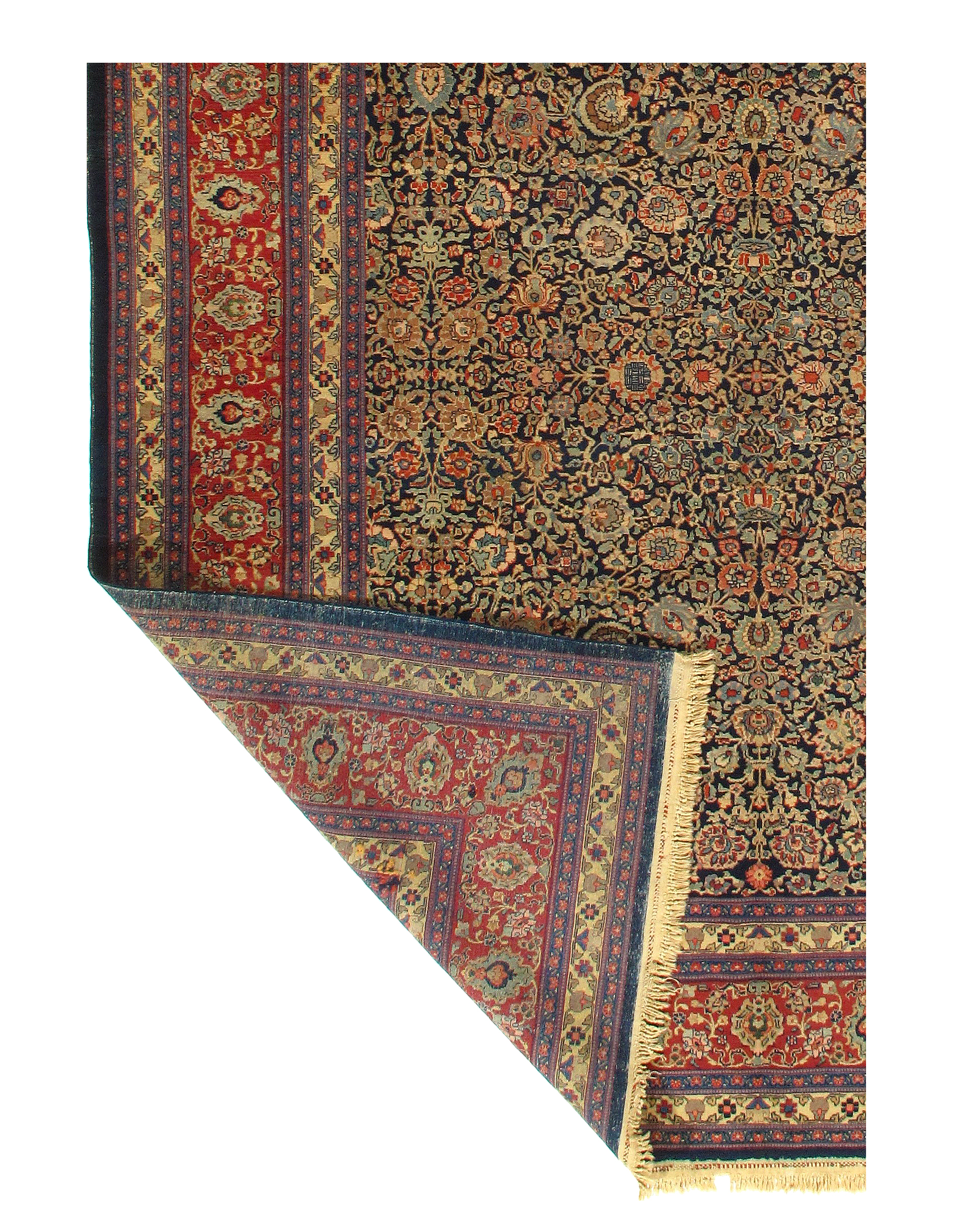 The sumptuous midnight blue background highlights the exquisite trellis vase design of this spectacular late 19th century antique Persian Tabriz rug. This antique Persian rug was produced during the Persian Qajar Dynasty that ruled the modern day country Iran from the late 18th century to the early 20th century. It was known as Sublime State of Persia and was time of wealth and grandeur, as is reflected by this fine piece of artwork from the time period.