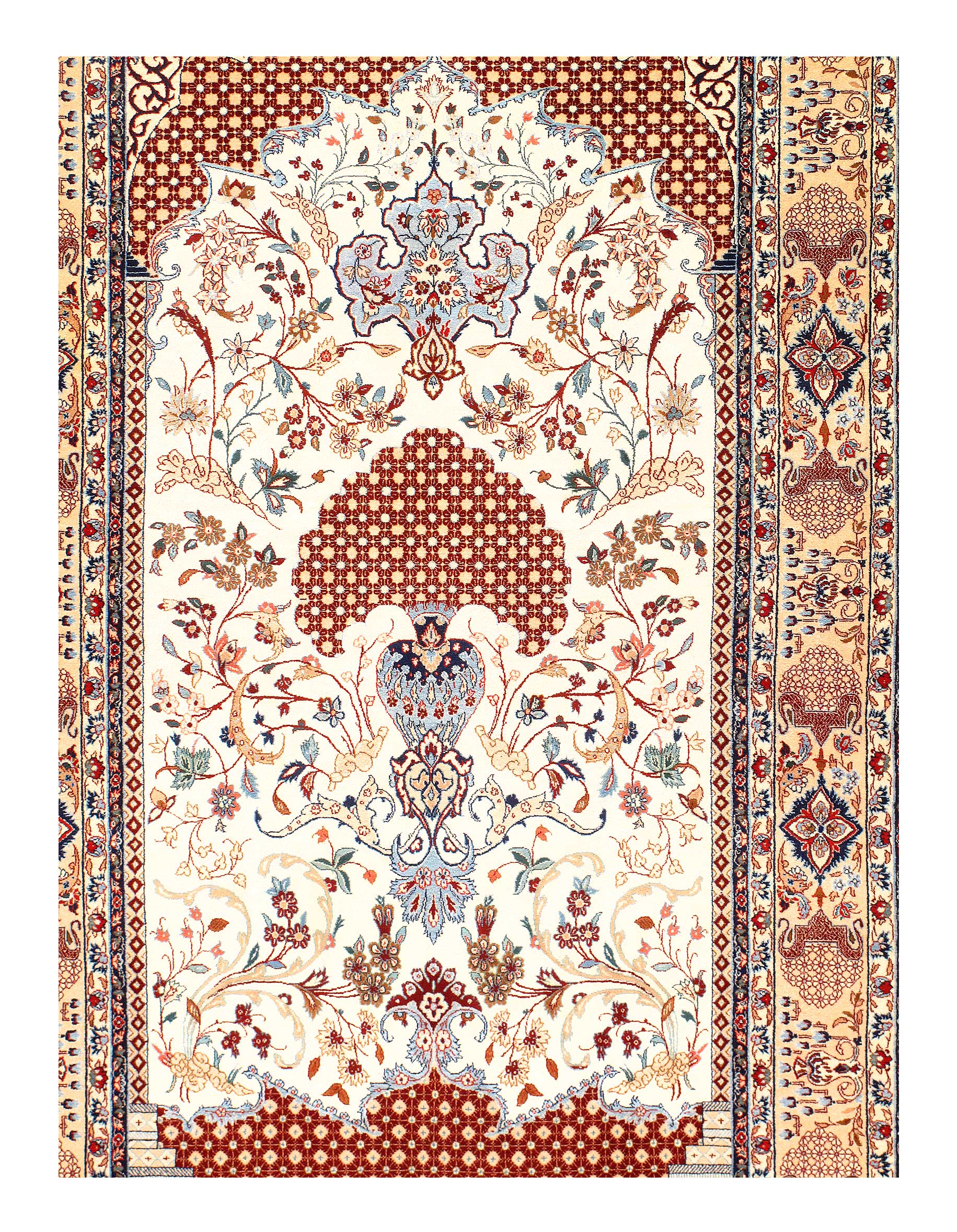 The Isfahan rugs are made with exceptionally good quality of wool & silk. They use traditional motifs inspired by architectural tiles that once decorated the historical buildings from which these rugs originated in. When it comes to high class designs the composition, patterns, and materials of Isfahan meets those expectations. The motifs usually consist of medallions with palmetts and also figural motifs. Isfahan rugs have an extremely high knot density and are woven with silk and golden threads, which give them their luxurious look.signed By serafian