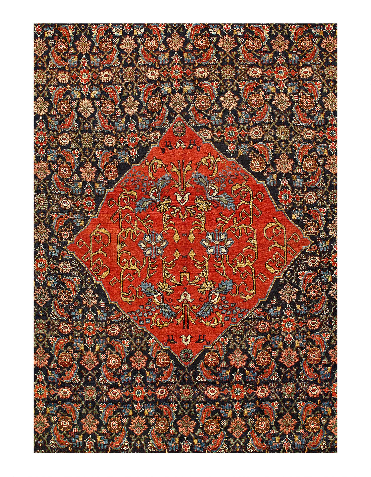 The rug displays a striking combination of deep navy, rust, and Light blue hues. Furthermore, a large central medallion dominates the field, surrounded by elaborate floral motifs. As a result, the border features an intricate pattern that complements the central design. Notably, the contrast between the dark background and lighter details enhances the visual appeal.