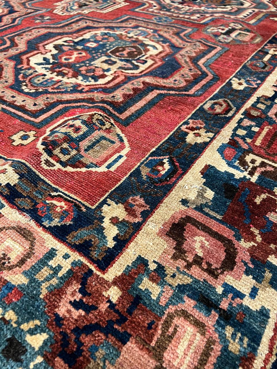 Offered is a gorgeous Persian Bakhtiari area rug. The luxurious hand-knotted pile is made from very fine lamb's wool and features a traditional Bakhtiari motif throughout. Handmade hand-knotted lamb's wool on a cotton foundation.