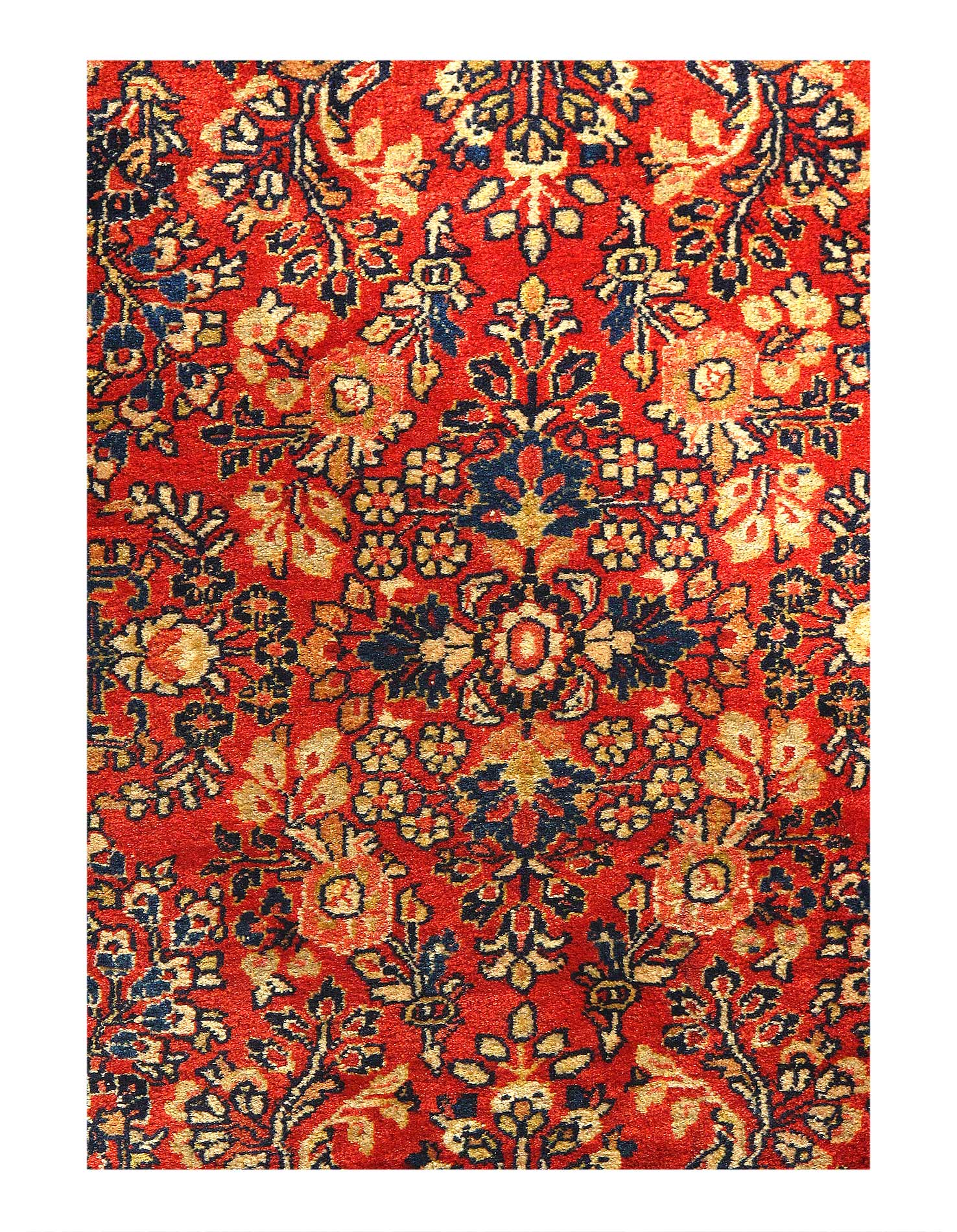 Antique Persian Sarouk rug with Art Nouveau style features an impressive all-over floral design rendered in a rich color palette, illuminating its lively composition. Highlighting timeless elements of Persian design, this antique Sarouk is impeccably woven and full of character with its meticulously detailed field. The charmingly all-over pattern of delicate botanical motifs combined with playful florals unfold a well-balanced design scheme. The refined color palette contributes to the overall magnificence of this antique Sarouk rug, while the compelling embellished border encloses this captivating work of art. With its well-balanced pattern and an elegantly appointed curvilinear composition, this antique Sarouk rug provides an artistic impact to complement a wide range of interiors. Hand-knotted wool. Made in Iran (Persia).