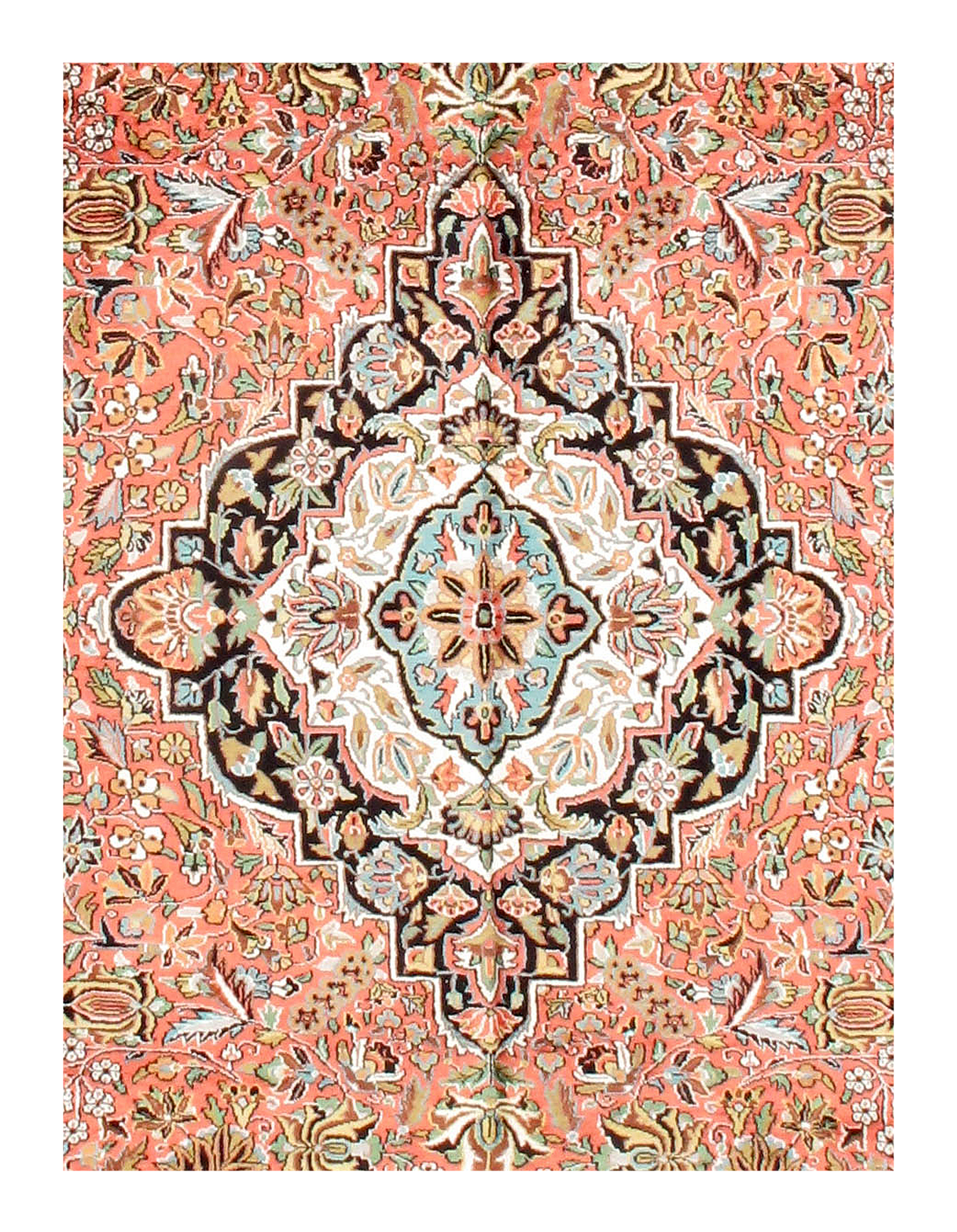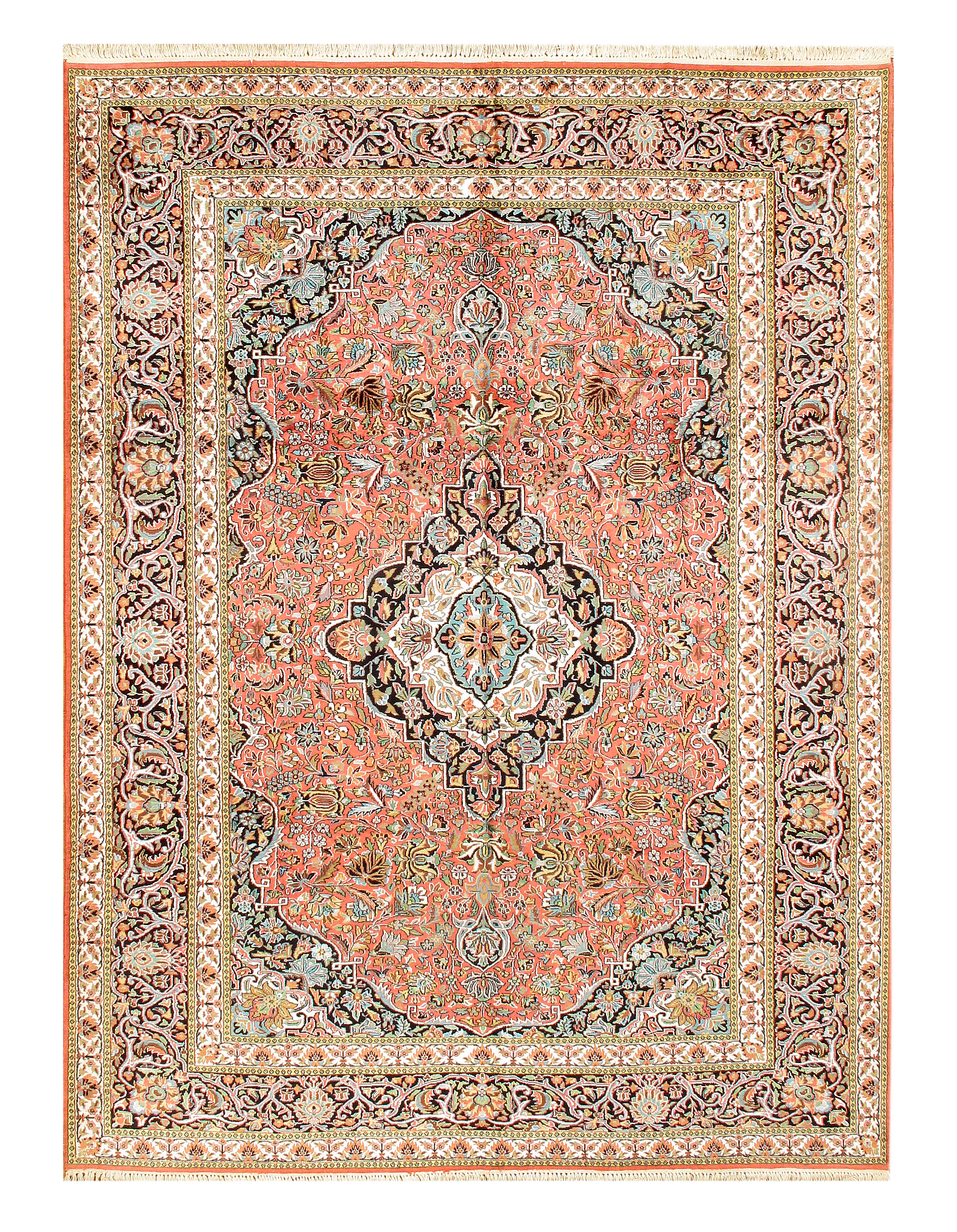 Exquisitely hand-woven and intricately designed V,silk rug, hand-knotted by skilled artisans and rug weavers. This Tabriz Style Hand Woven Silk Rose /Navy Blue Area Rug is made using silk fibers and threads, with a Tabriz-styled center in shades, against the backdrop of an emerald base. The beautiful mix of various other colors and add more depth and luxury to this classic piece.