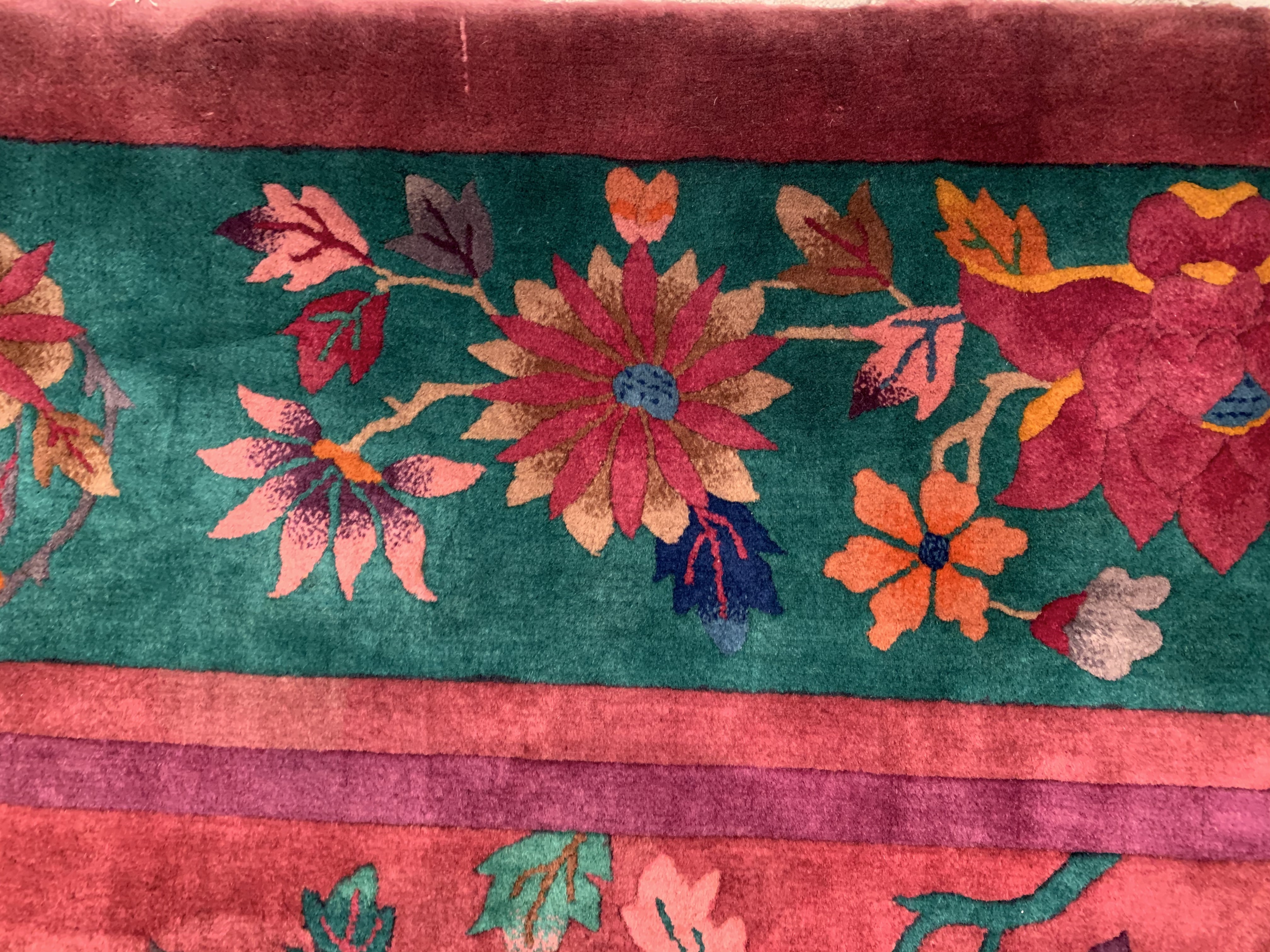 Chinese Deco Rug, Origin: China, Circa: Early 20th Century – Here is an exciting and appealing antique Oriental carpet – an antique Art Deco rug that was designed and woven in China during the early years of the twentieth century. Heavily informed by the aesthetic inclinations of the Art Deco period, this unique carpet is a compelling and thought-provoking example. A scalloped border of Blue encloses a Rose / Rust sand field on this exquisitely subtle and restrained antique Chinese Art Deco. At first the field appears empty or open, but it is actually covered by a tone-on-tone design of scrolls and cloud-bands emanating inward from the outer edges. In their sinuous rhythms they echo the scalloped forms of the border and continue its visual effects across the carpet in a more subdued manner. This carpet testifies to the masterful design sensibilities of Chinese weavers as they made the transition into the modern world. The Art Deco movement had an outside influence on the world of art and design, and some of the most important qualities and characteristics of that movement may be found in this fine rug.