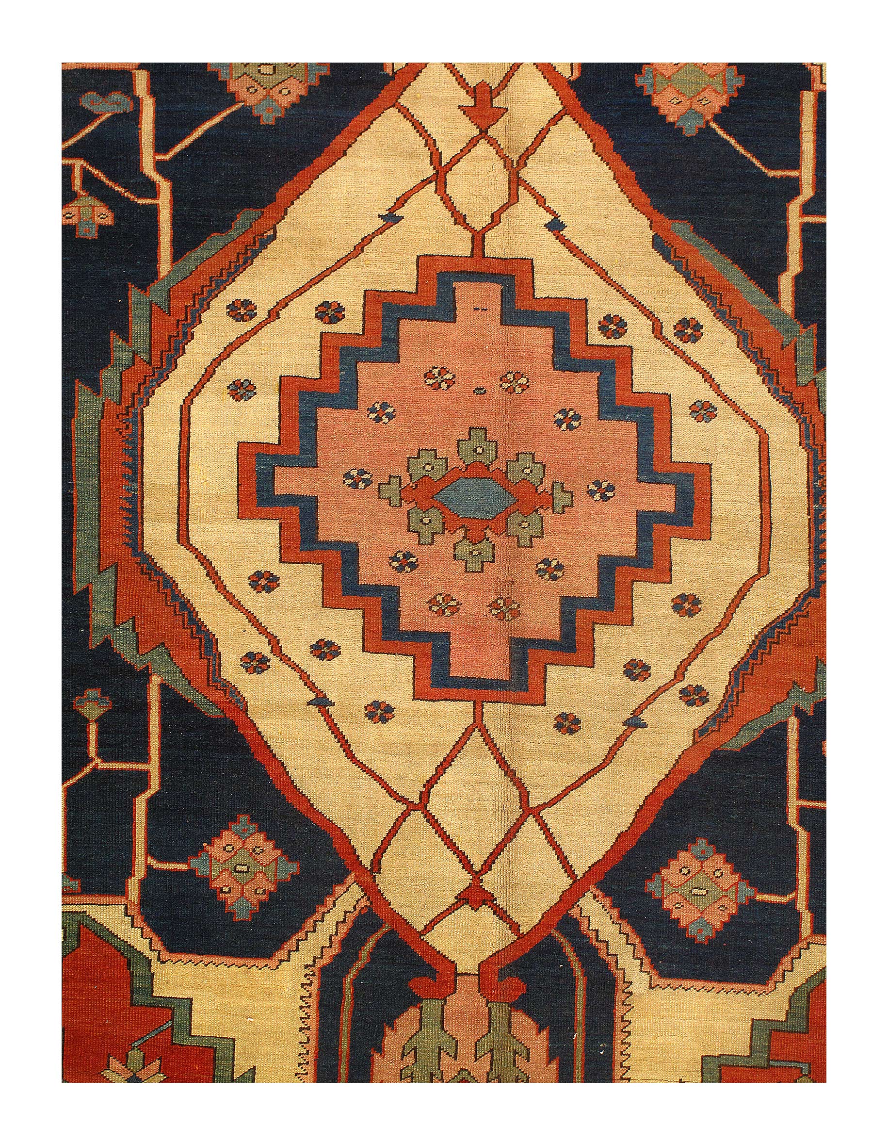 This beautiful antique Persian rug is a choice example of the Bakshaish Rugs, boasting many of the qualities most sought after in such pieces. The monumental medallion of striking red that dominates the piece is a brilliant articulation of the Bakshaish tendency to utilize bright, rich tones. Similarly, the abstract geometric design elements that pepper the field of blue are a typical Bakshaish element, their careful lines and unique shapes characteristic of an ancient concept of design that is as powerful to behold today as it has ever been. Geometric figures of alternating color populate the paneled border, each seemingly dancing in its own square. The strength of the overall composition of this splendid Bakshaish lives in its rich colors, abstract geometric figuring, and graphic boldness, which combine to create a beautiful and representative piece of art.