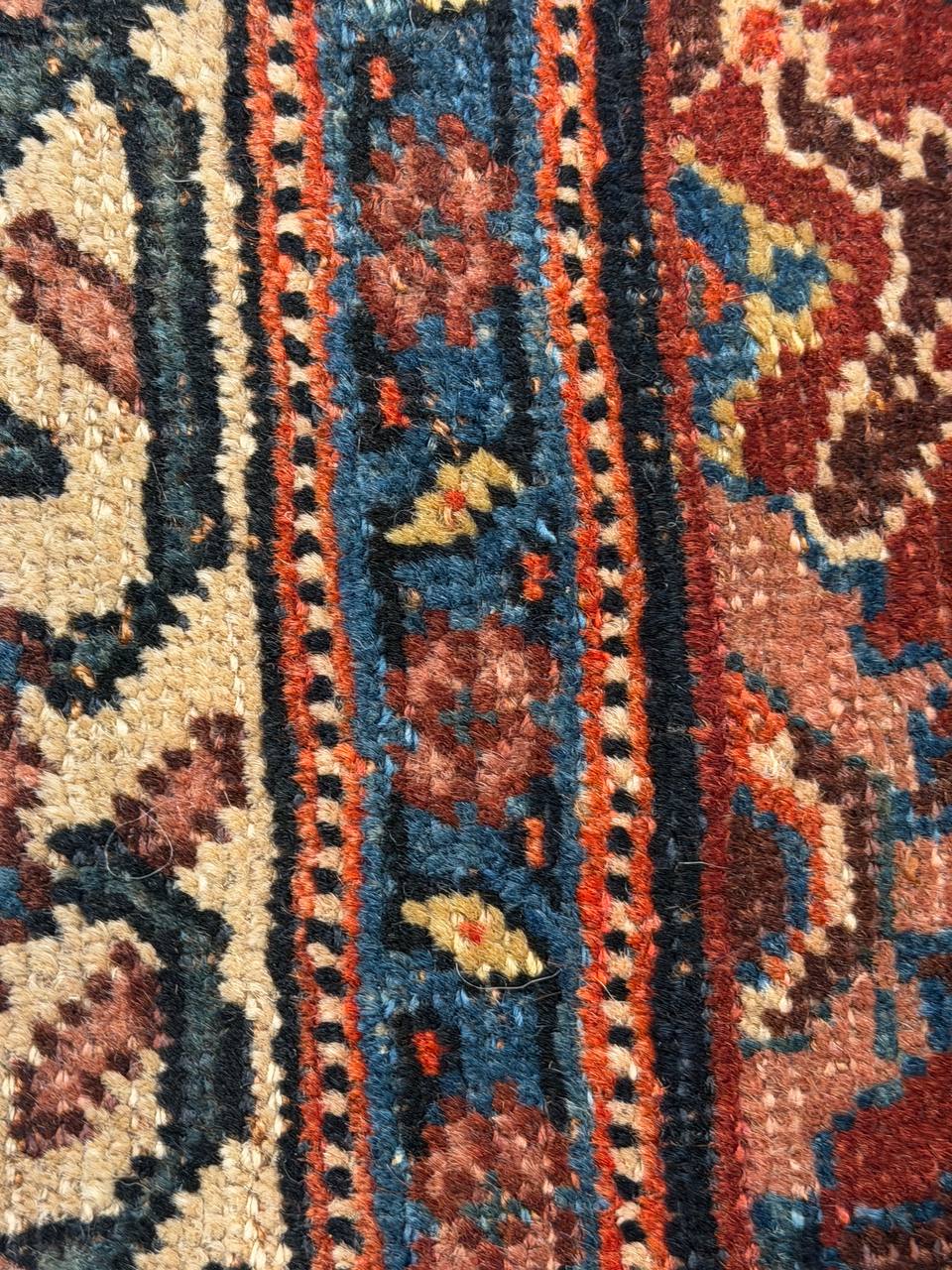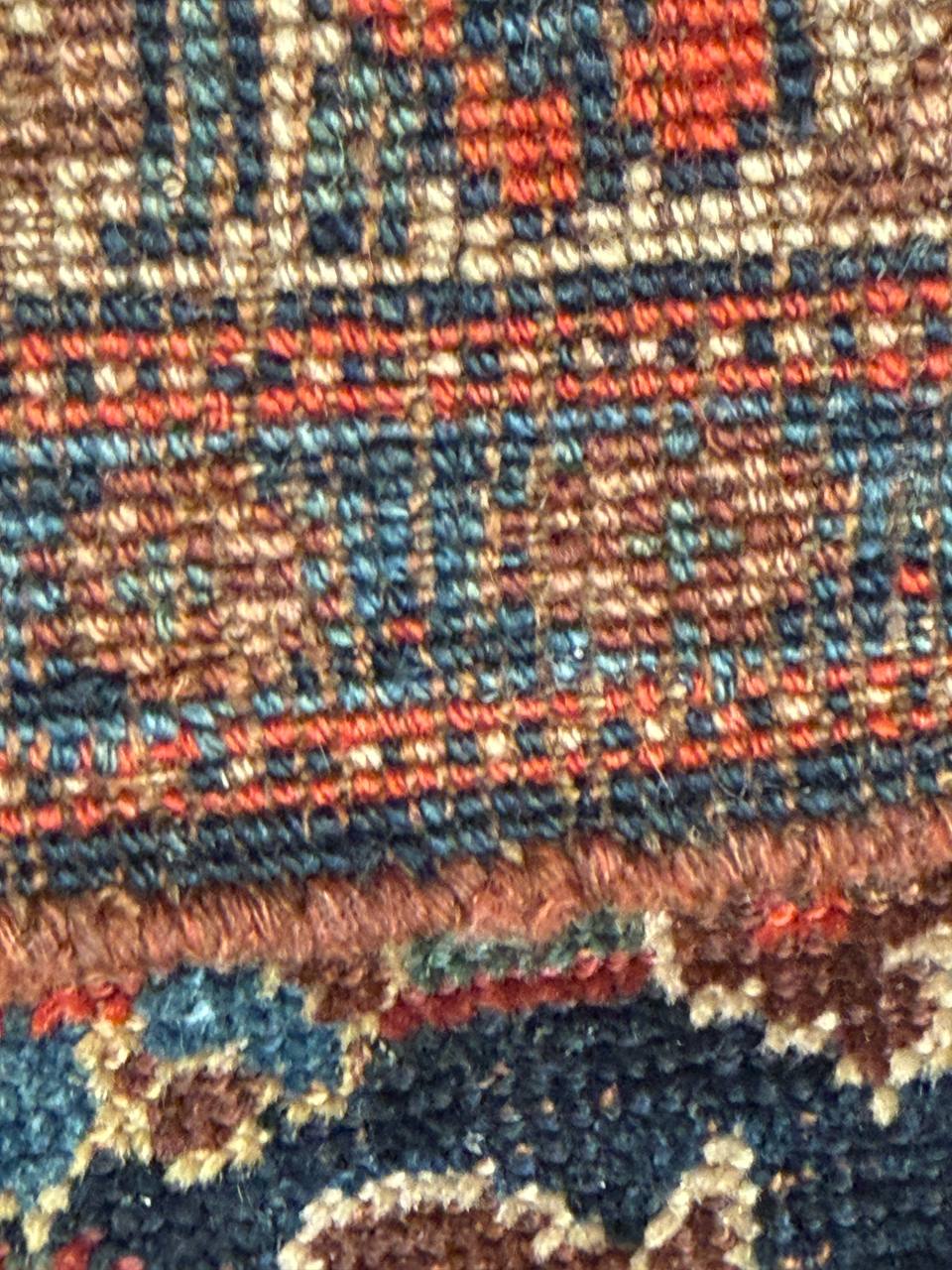 Vintage Persian Bidjar Rug, Origin: Persia – This carpet from the famed village of Bidjar showcases a superlative Medallion arabesque with extreme curvilinear decorations that represent a compilation of classical motifs inspired by Persia’s great weaving centers. The cosmopolitan arabesque displays a collection of sensuous vinescrolls arranged in a flamboyant medallion-style pattern. Recurving tendrils with stylized calyces meander across the obscure blue ground linking large-scale palmettes, carnations and feathered leaflets with polychromatic accents. These intricate motifs are enhanced by vivid hues of crimson, navy color and ivory juxtaposed against the deep, dark ground. Lavish crimson main borders filled with graceful turtle motifs provide a subtle northwest Persian influence while maintaining the curvilinear city-style form that gives this vintage Bidjar rug such a geometric appearance and a level of elegance associated with the golden age of Persian art.