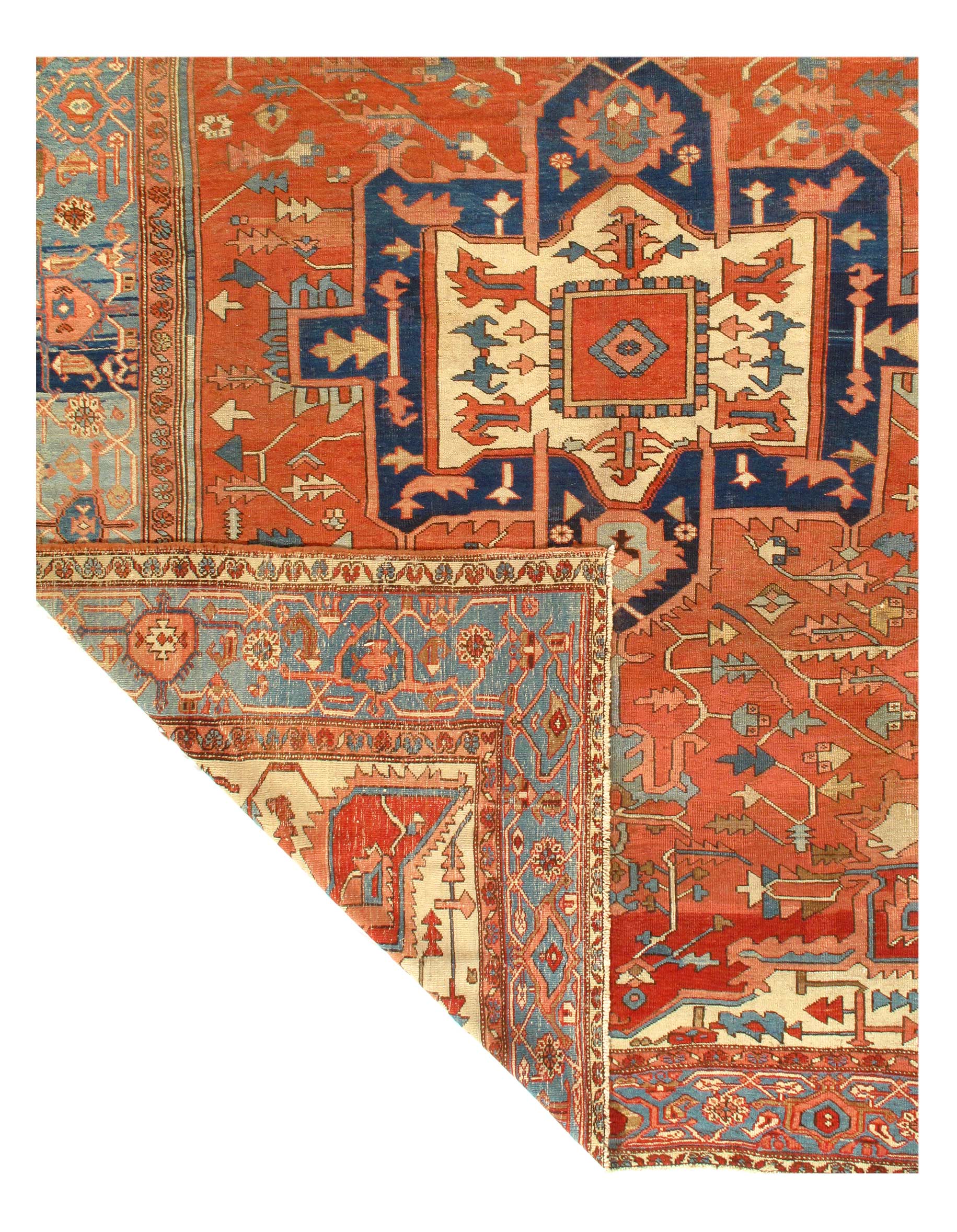 Antique Serapi rugs were made by small workshops and families, which resulted in formal Persian carpets as well as those with rustic tribal influences. Local production methods contributed to the characteristic abrash that adds a textural appearance to the stark field and contrasting decorations seen in many Persian Serapi rugs. These fine antique carpets were made in many sizes and shapes ranging from elongated corridor carpets to highly desirable room-size rugs. Persian Serapi rugs feature clear colors, creamy un-dyed fleece beautifully tempered reds, warm earth tones and concentrated blues.