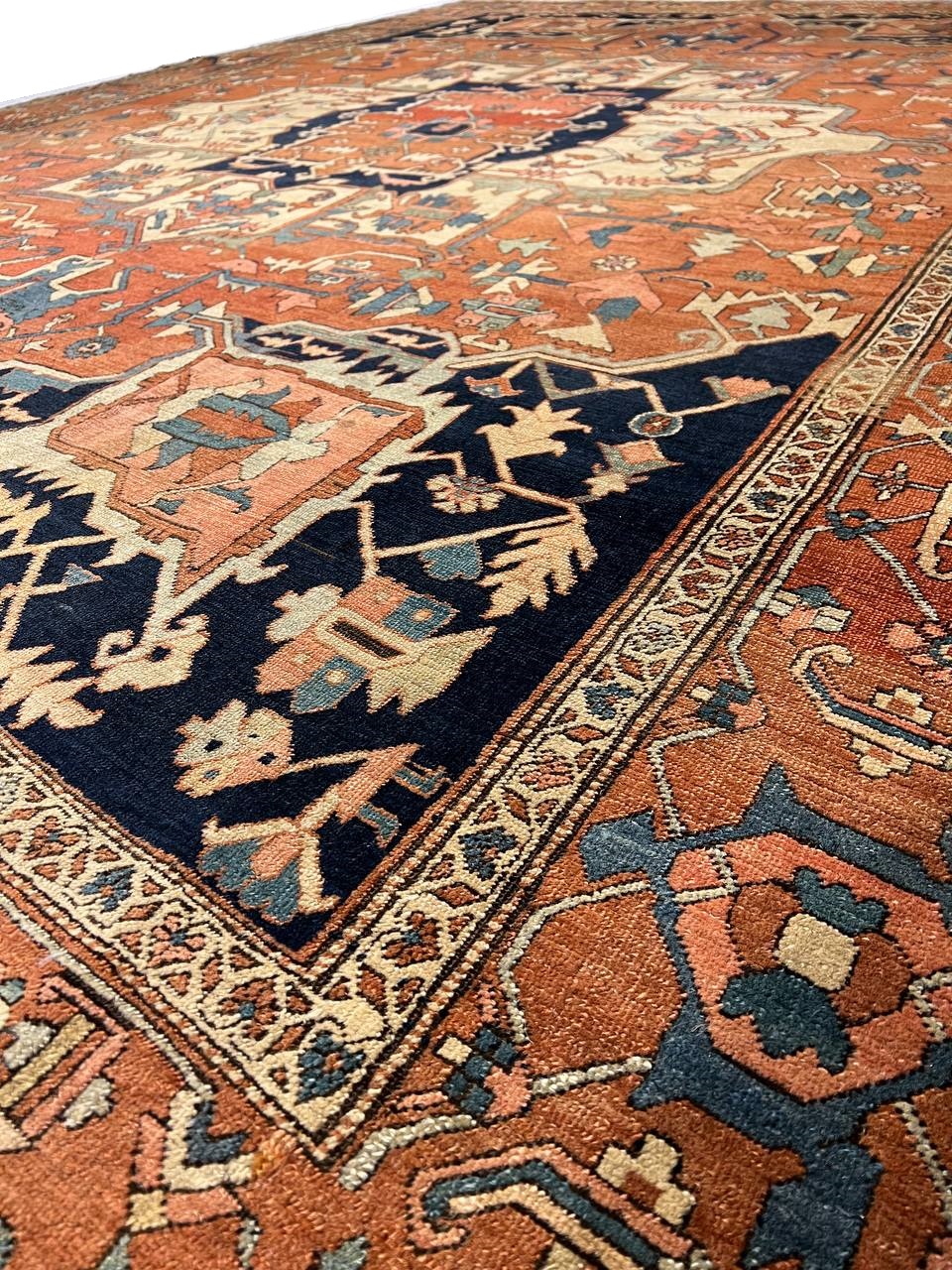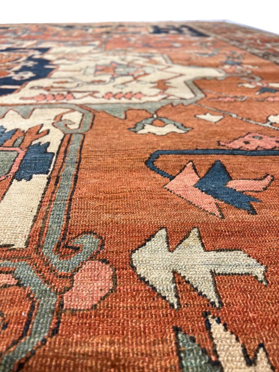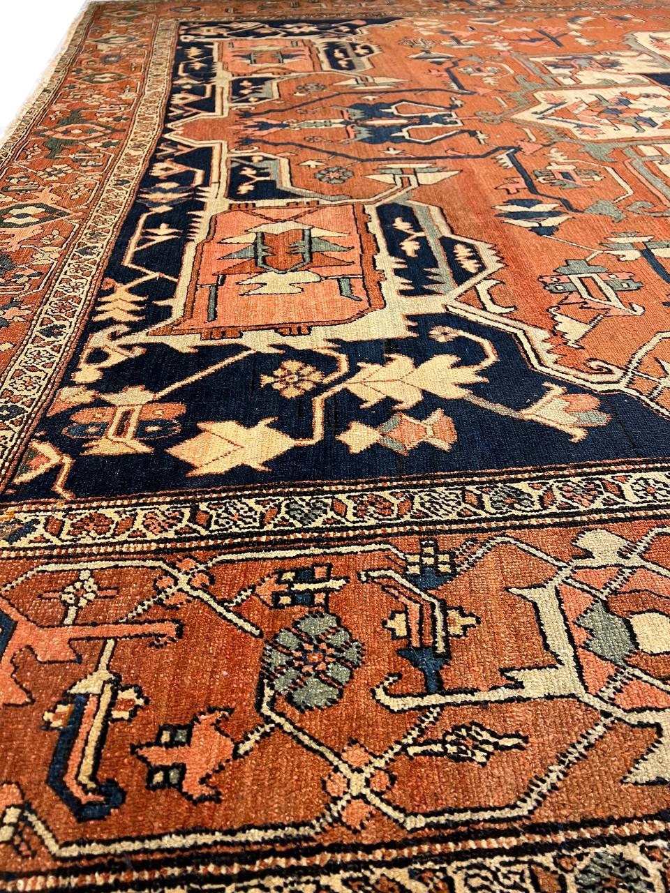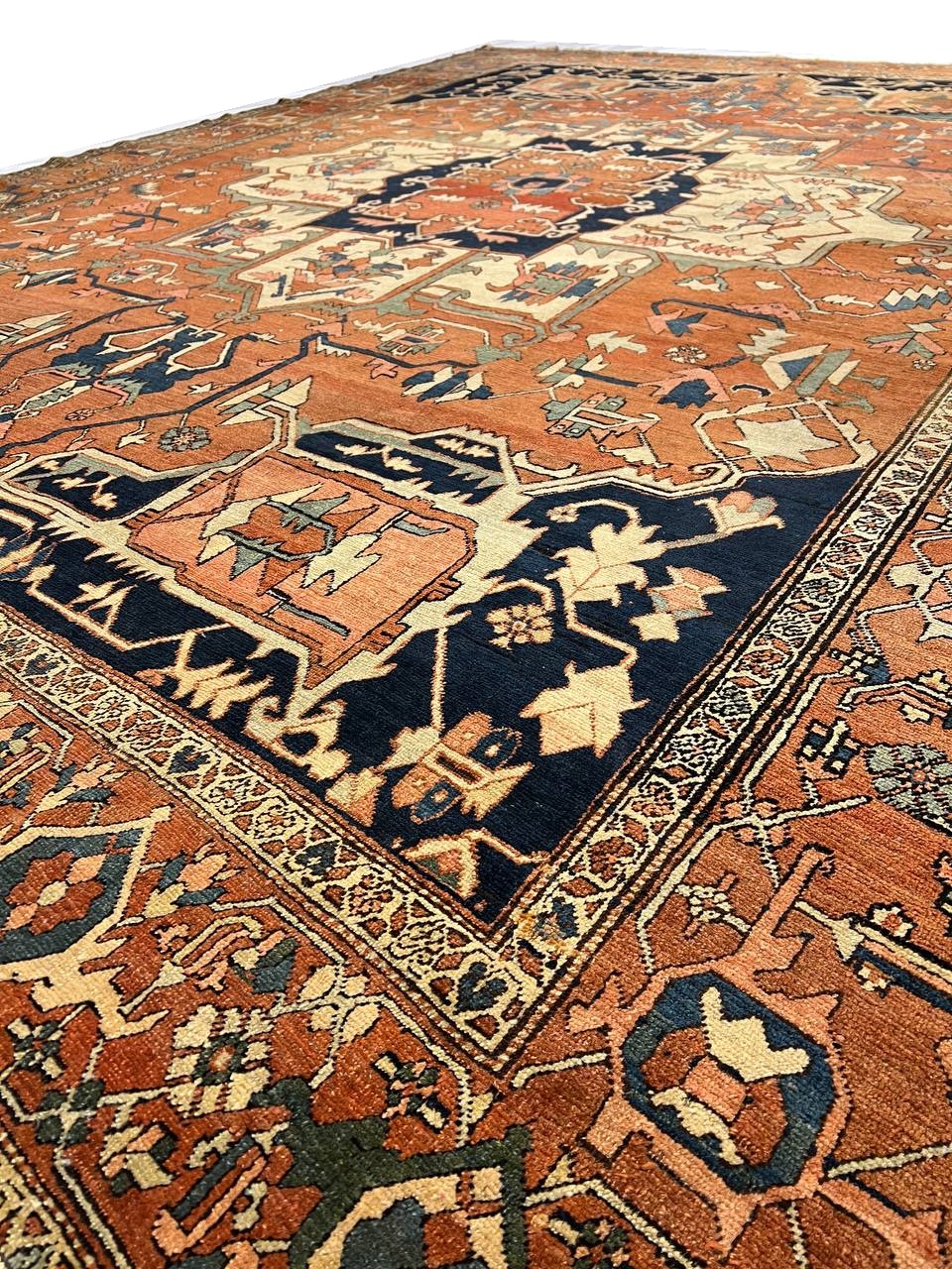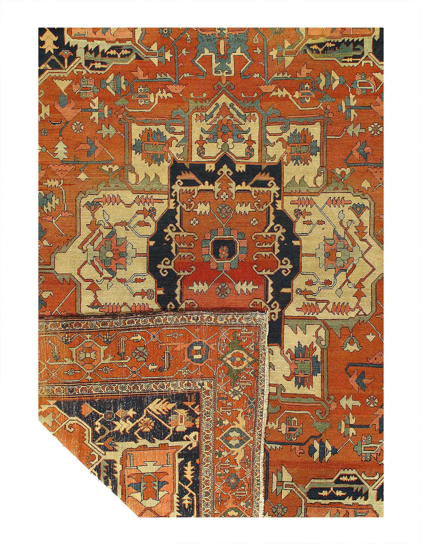antique Heriz Serapi Rug, Country of Origin: Persia, β The brilliant red field bears a central Ray of Life and many highly abstracted geometric shapes in this fascinating antique Heriz Serapi Persian Rug. Five flower blossoms cluster at different points along the mid-line, separated by riyu symbols in the shape of arrows. The patterns are gold color, rust, and green colors. A broad blue border presents scrolled geometric shapes, with jagged ruyi symbols connecting variably multi-colored medallions composed of diamond shapes with irregular outer edges. Three separate, narrow guard borders frame the border, each carrying a geometric pattern. Heriz is a community in Northwestern Iran famed for producing extremely long-lasting carpets and rugs, items that often pass down from one generation to another for many years. These antique rugs possess a coarse, durable consistency. The type of rugs made in Heriz is also sometimes produced in other places, including Bakhshaish and Gorevan. The highest grade of rug from the Heriz area is the Serapi, which was made around the turn of the Twentieth Century. Most Heriz rugs contain prominent knots but the Serapi is described as smoother.