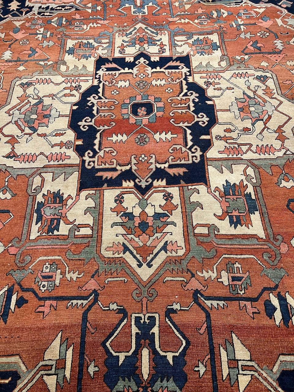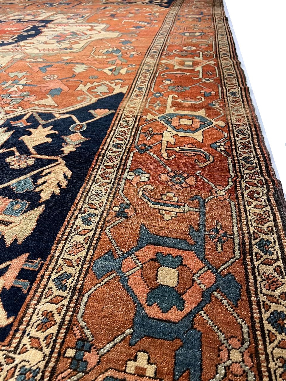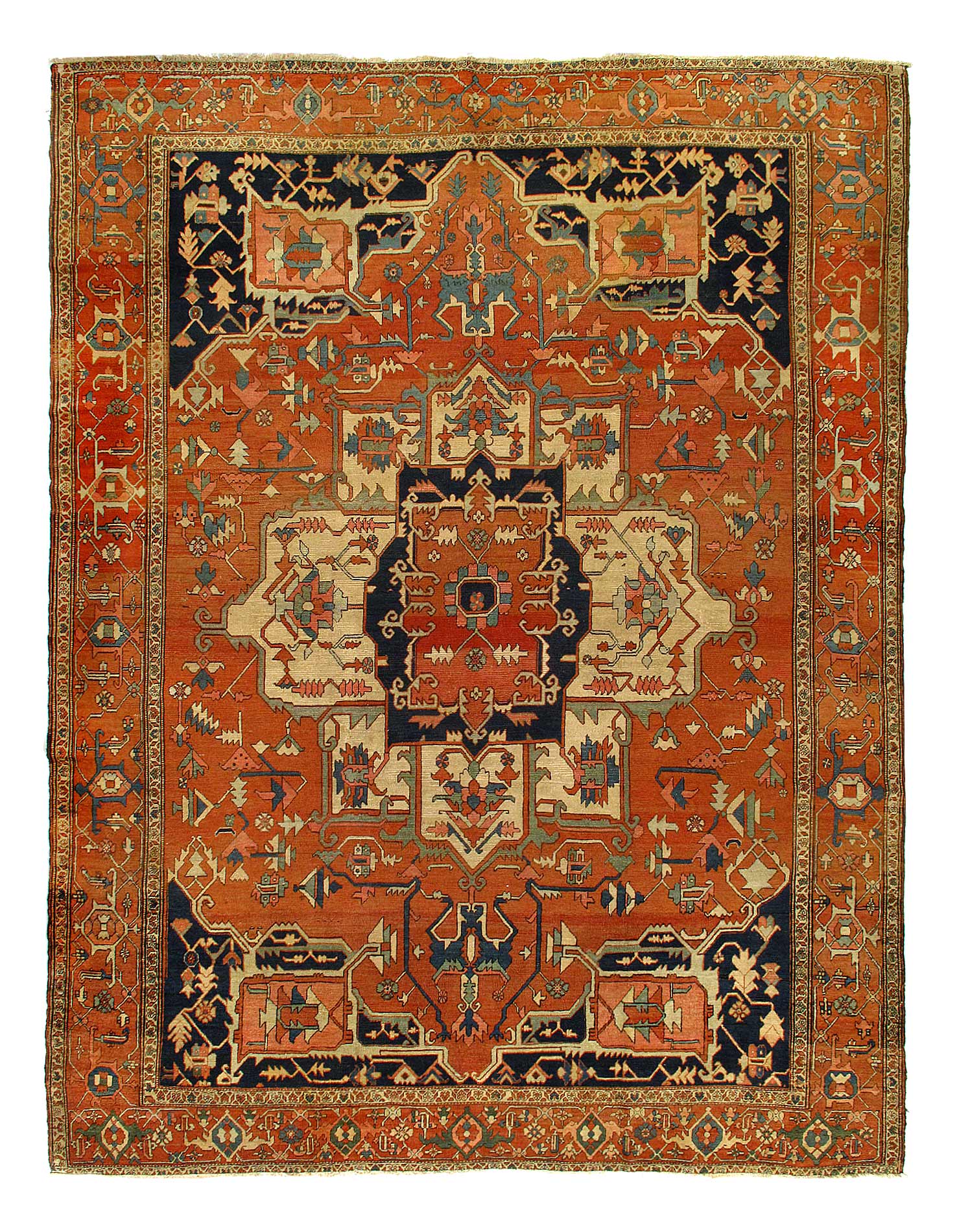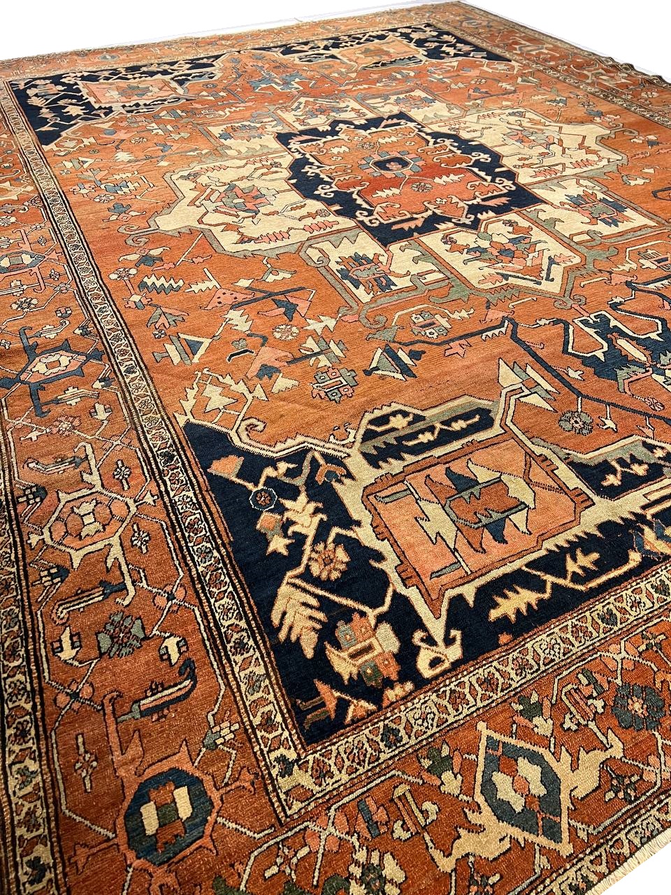 antique Heriz Serapi Rug, Country of Origin: Persia, β The brilliant red field bears a central Ray of Life and many highly abstracted geometric shapes in this fascinating antique Heriz Serapi Persian Rug. Five flower blossoms cluster at different points along the mid-line, separated by riyu symbols in the shape of arrows. The patterns are gold color, rust, and green colors. A broad blue border presents scrolled geometric shapes, with jagged ruyi symbols connecting variably multi-colored medallions composed of diamond shapes with irregular outer edges. Three separate, narrow guard borders frame the border, each carrying a geometric pattern. Heriz is a community in Northwestern Iran famed for producing extremely long-lasting carpets and rugs, items that often pass down from one generation to another for many years. These antique rugs possess a coarse, durable consistency. The type of rugs made in Heriz is also sometimes produced in other places, including Bakhshaish and Gorevan. The highest grade of rug from the Heriz area is the Serapi, which was made around the turn of the Twentieth Century. Most Heriz rugs contain prominent knots but the Serapi is described as smoother.