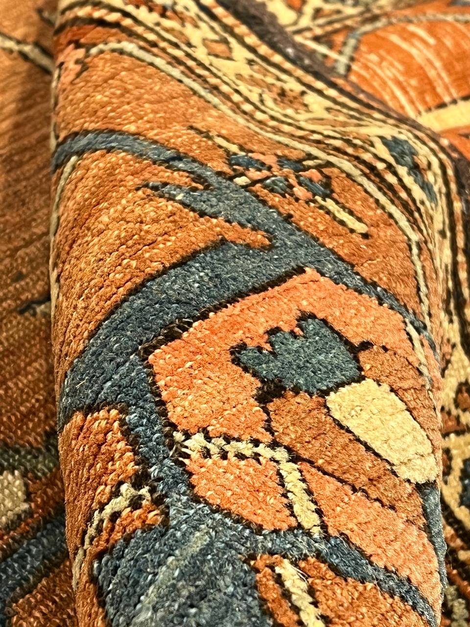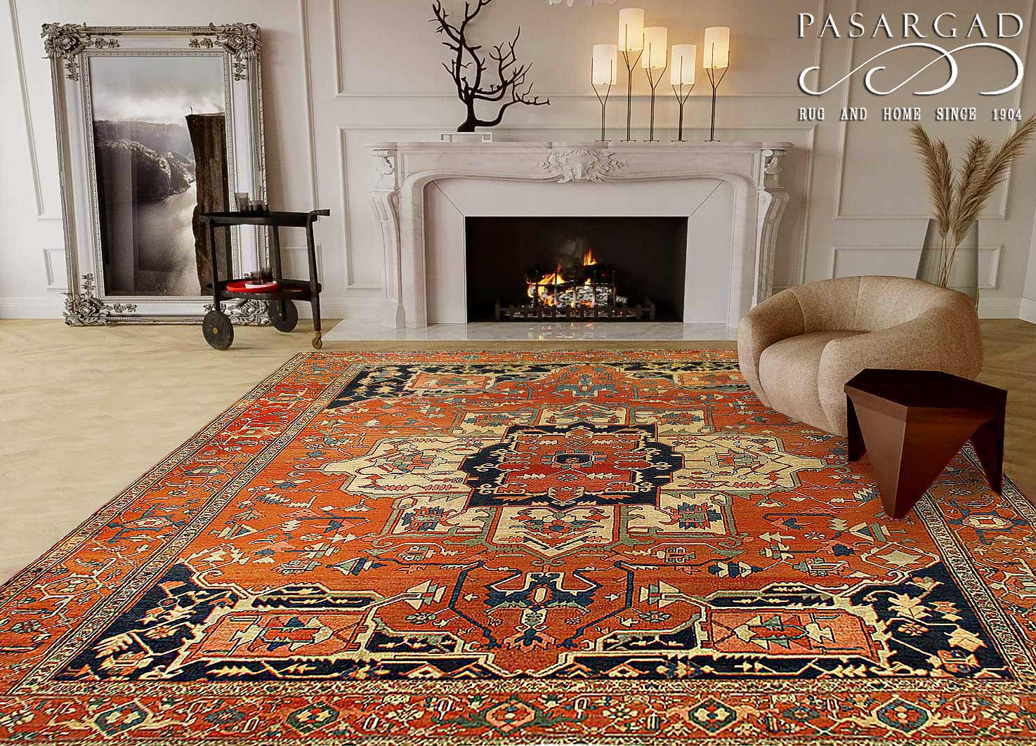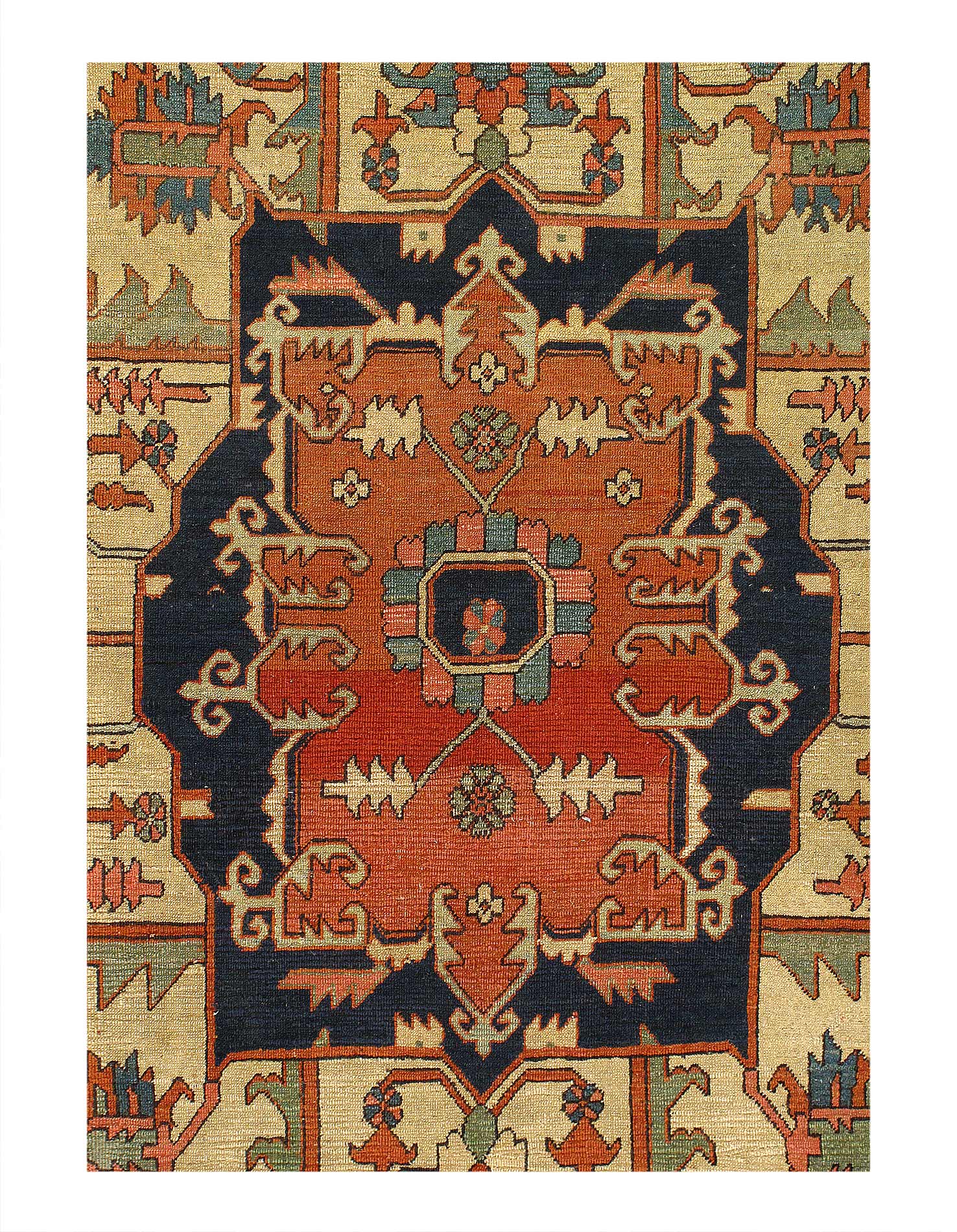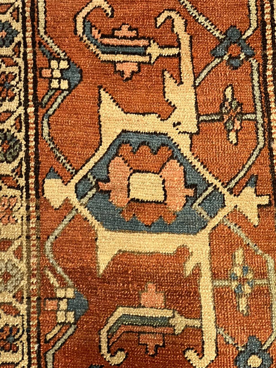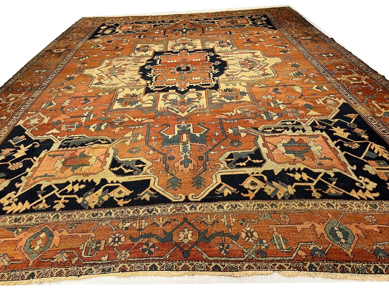 antique Heriz Serapi Rug, Country of Origin: Persia, β The brilliant red field bears a central Ray of Life and many highly abstracted geometric shapes in this fascinating antique Heriz Serapi Persian Rug. Five flower blossoms cluster at different points along the mid-line, separated by riyu symbols in the shape of arrows. The patterns are gold color, rust, and green colors. A broad blue border presents scrolled geometric shapes, with jagged ruyi symbols connecting variably multi-colored medallions composed of diamond shapes with irregular outer edges. Three separate, narrow guard borders frame the border, each carrying a geometric pattern. Heriz is a community in Northwestern Iran famed for producing extremely long-lasting carpets and rugs, items that often pass down from one generation to another for many years. These antique rugs possess a coarse, durable consistency. The type of rugs made in Heriz is also sometimes produced in other places, including Bakhshaish and Gorevan. The highest grade of rug from the Heriz area is the Serapi, which was made around the turn of the Twentieth Century. Most Heriz rugs contain prominent knots but the Serapi is described as smoother.