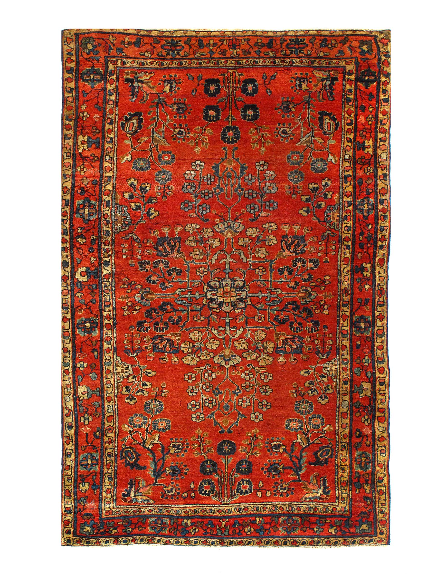 This is an antique handmade rug from the early 20th century. The piece was crafted from lamb's wool on a cotton foundation and was vegetable dyed. It has a dense, soft pile, and excellent quality, to ensure that you will enjoy it for years to come.