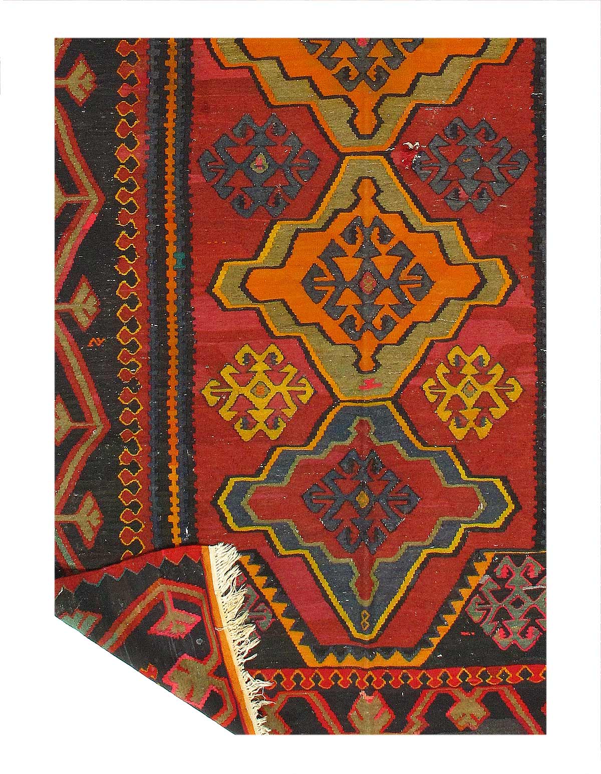 Vintage Kilim rug. Hand knotted. 100% Lamb’s wool and lamb’s wool pile. Flat weave. This collection complements any room looking for a fresh update. The unique trait about these thin rugs is that they’re reversible. From Russia.