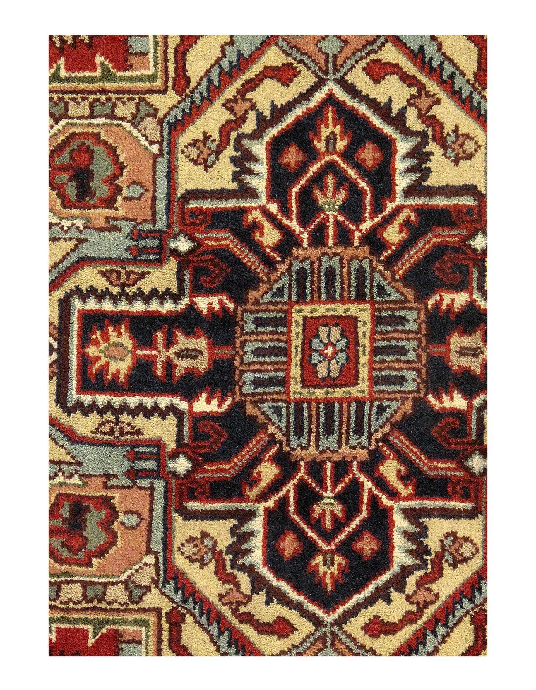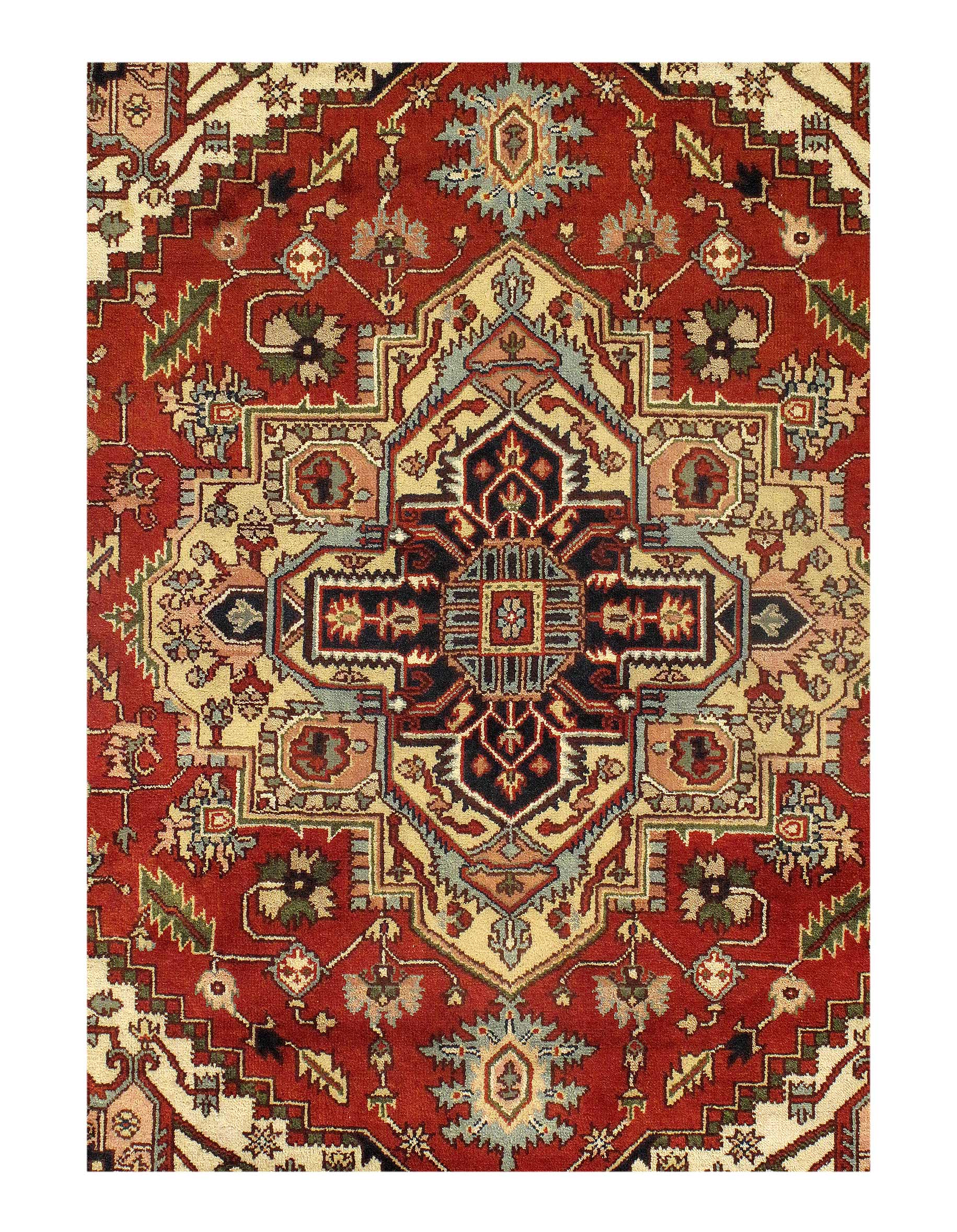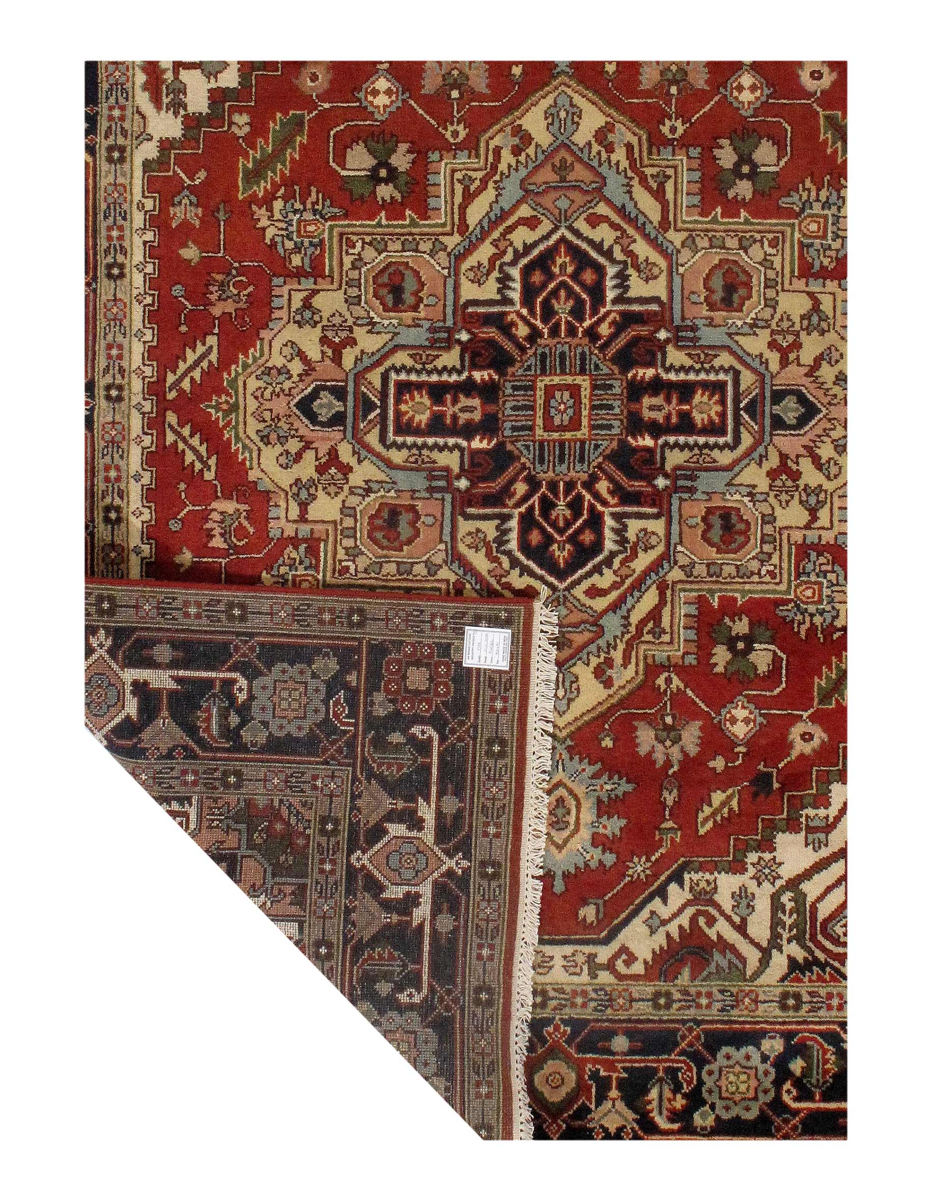 Indo Serapi design rug. Handmade Hand-knotted in fine lambswool. Lamb's Wool on a Cotton Foundation Vegetable Dyed Hand-Spun Wool Rug The Serapi Rug is one of the most sought after rugs particularly in the USA and England for many years. No other rug so epitomizes the "East Coast Establishment" than the Serapi carpet This rug has a dense, soft pile, and excellent quality, to ensure that you will enjoy the look and feel of your rug for years to come