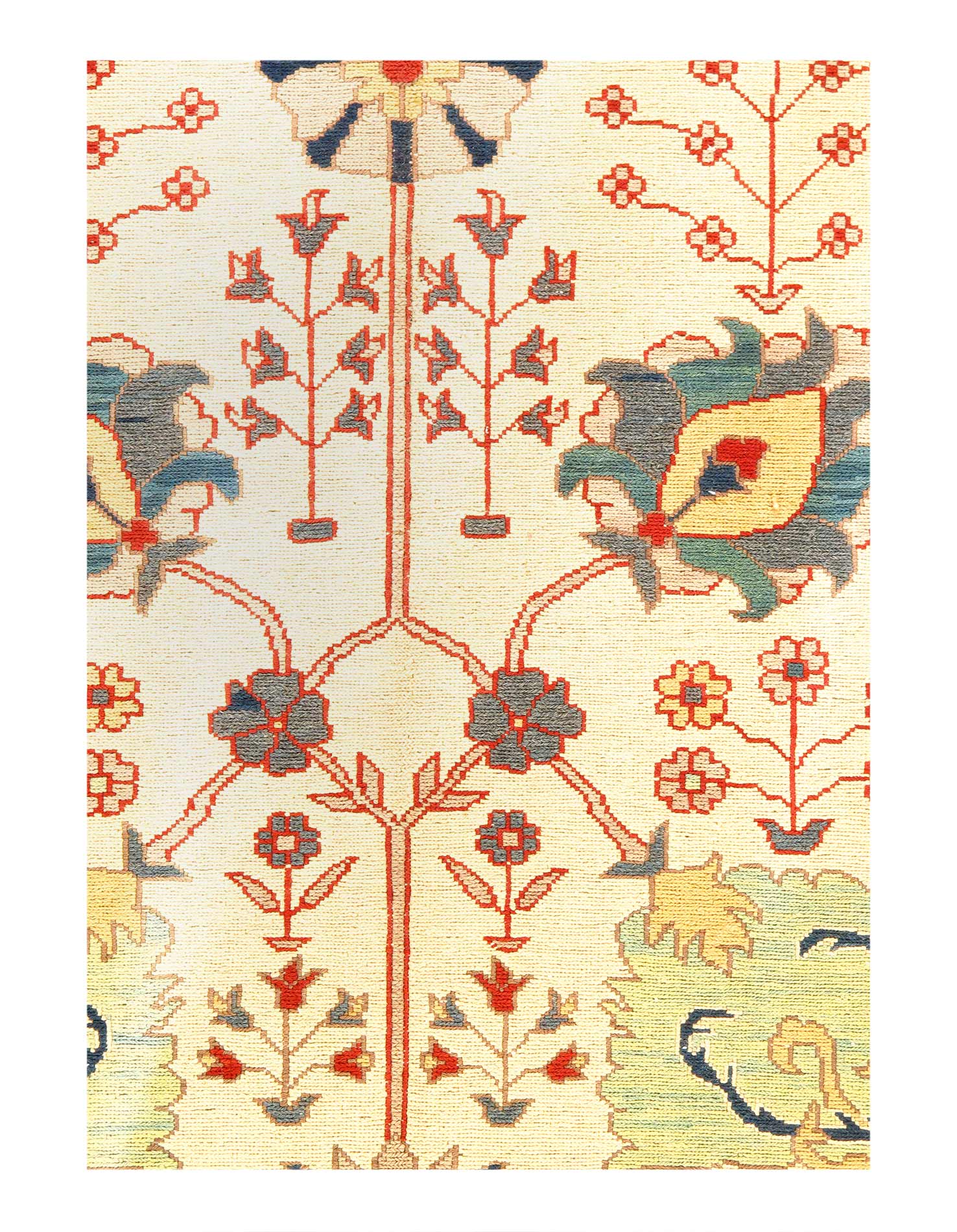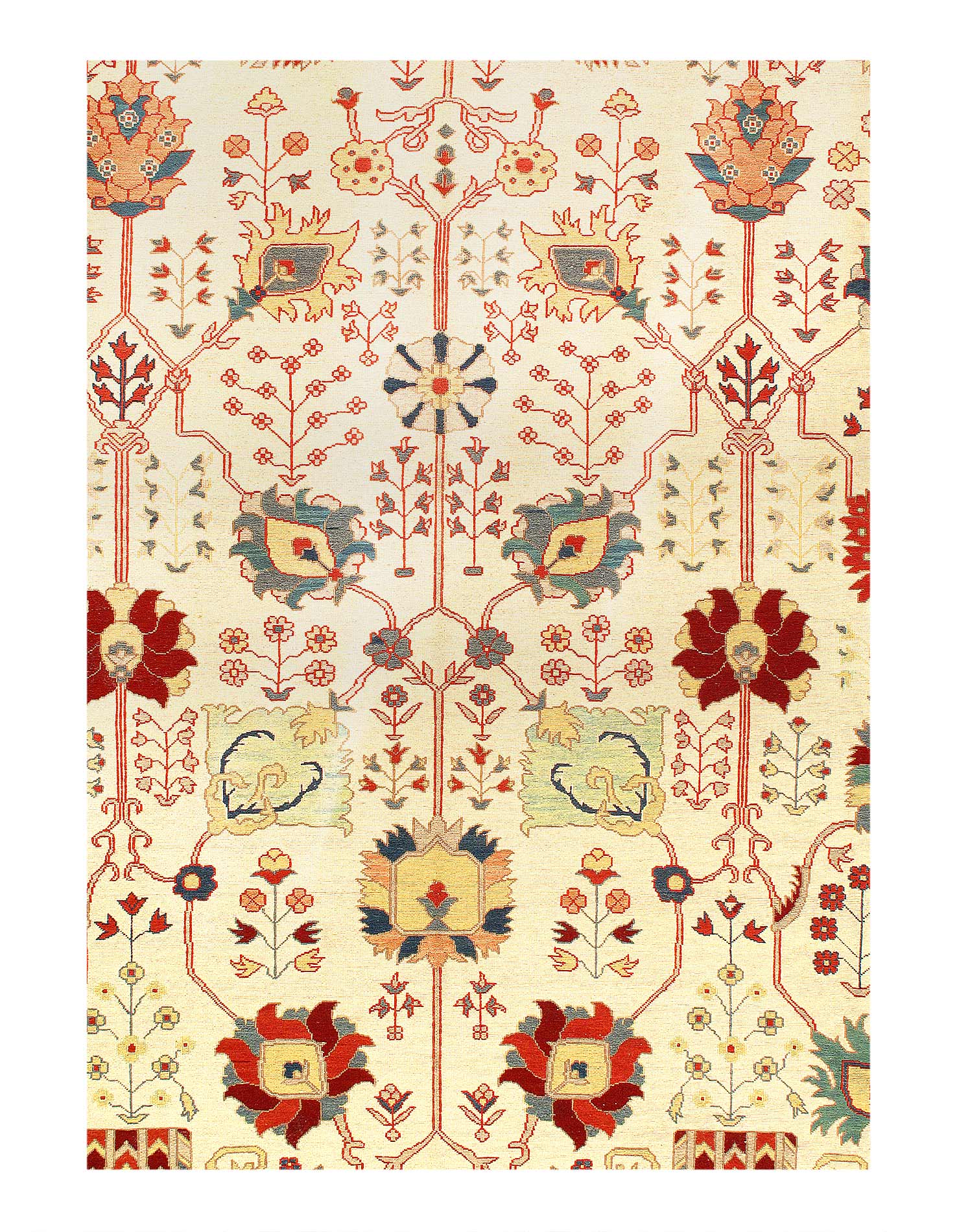 In design, Soumak weaving is perhaps most fascinating for its integral incorporation of wefts, unique among Oriental carpets. The wefts of Soumak textiles are not merely structural elements, but instead are woven visibly against the warp to create astonishingly elaborate, richly-detailed motifs, the best of which rival finely woven piled rugs in balance, coloring, and creativity. Tribal weavers of the form draw heavily on historic local symbols and geometric patterns, but typically also whimsically include tiny birds and geometric renderings of native animals in their final designs, either as accents or as central figures of the rugs. Of course when speaking of design we can only speak in generalities; Soumak, it should be restated, refers to technique rather than place of origin, and examples of the form have been found to draw on everything from Persian garden motifs to medallion motifs to palatial designs of the 16th century Persian Empire. Still, generalities can be useful, and not inaccurate, and among the varied designs found among antique Soumak rugs, the most common originate with the Shahsavan Tribe of modern day Azerbaijan and Northwest Persia. In the 17th century, the Shahsavan are said to have served as the personal guards to Shah Abbas during one of the most important periods in the history of Persian carpet making. In the grand court of Abbas, they would have had unique exposure to some of the finest carpets in the world.