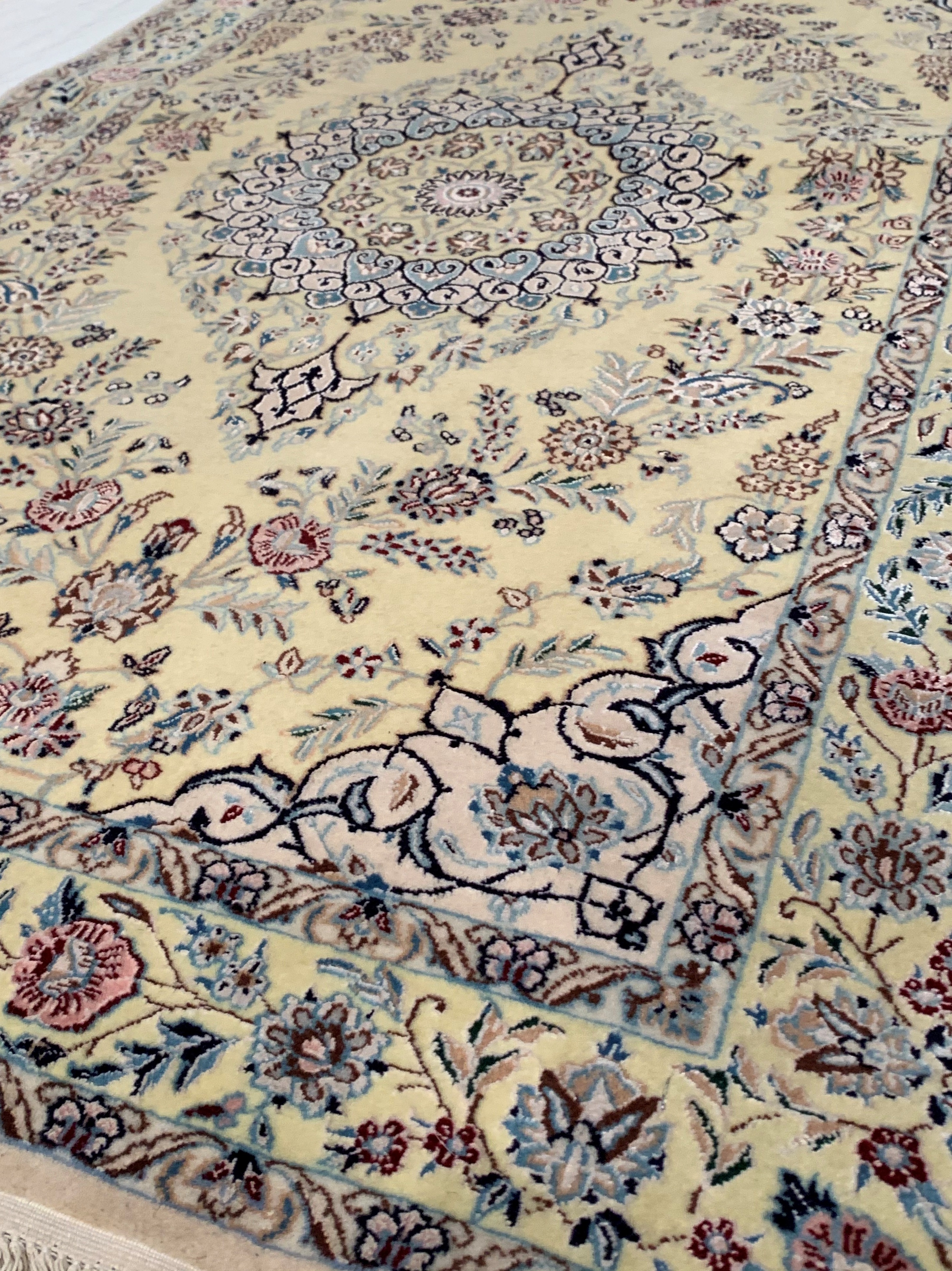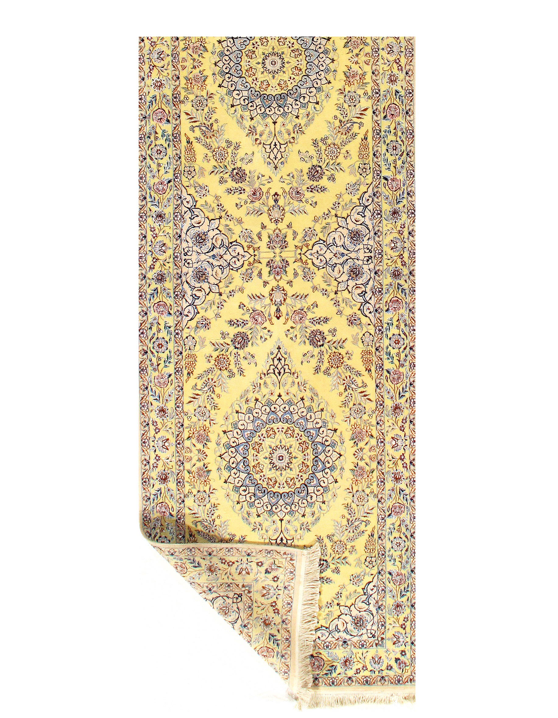 Persian Nain rugs are renowned for their detail and fine use of outlining along the central motifs. Breaking from the classical style of many vintage rugs produced around central Iran, Persian Nain rugs became renowned for their modern appeal and personal style, establishing the classical motifs of many other regional rugs, only through a more precise lens. In this striking piece, the precision is particularly visible along the heart of the vintage Persian rug, where the attention to detail allows each individual color to stand out as a unique part of the whole. The surrounding borders help ground the masterpiece and add horizontal intrigue to the natural elements within, which are arranged vertically to establish a cascading effect.