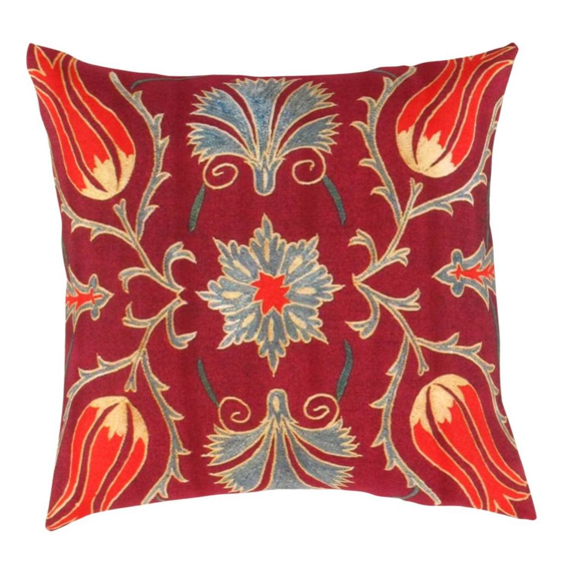 ● True to the “needle” origin of the Persian word suzani, these pillows are embroidered with traditional floral motifs in richly coloured patterns that define this historic style.