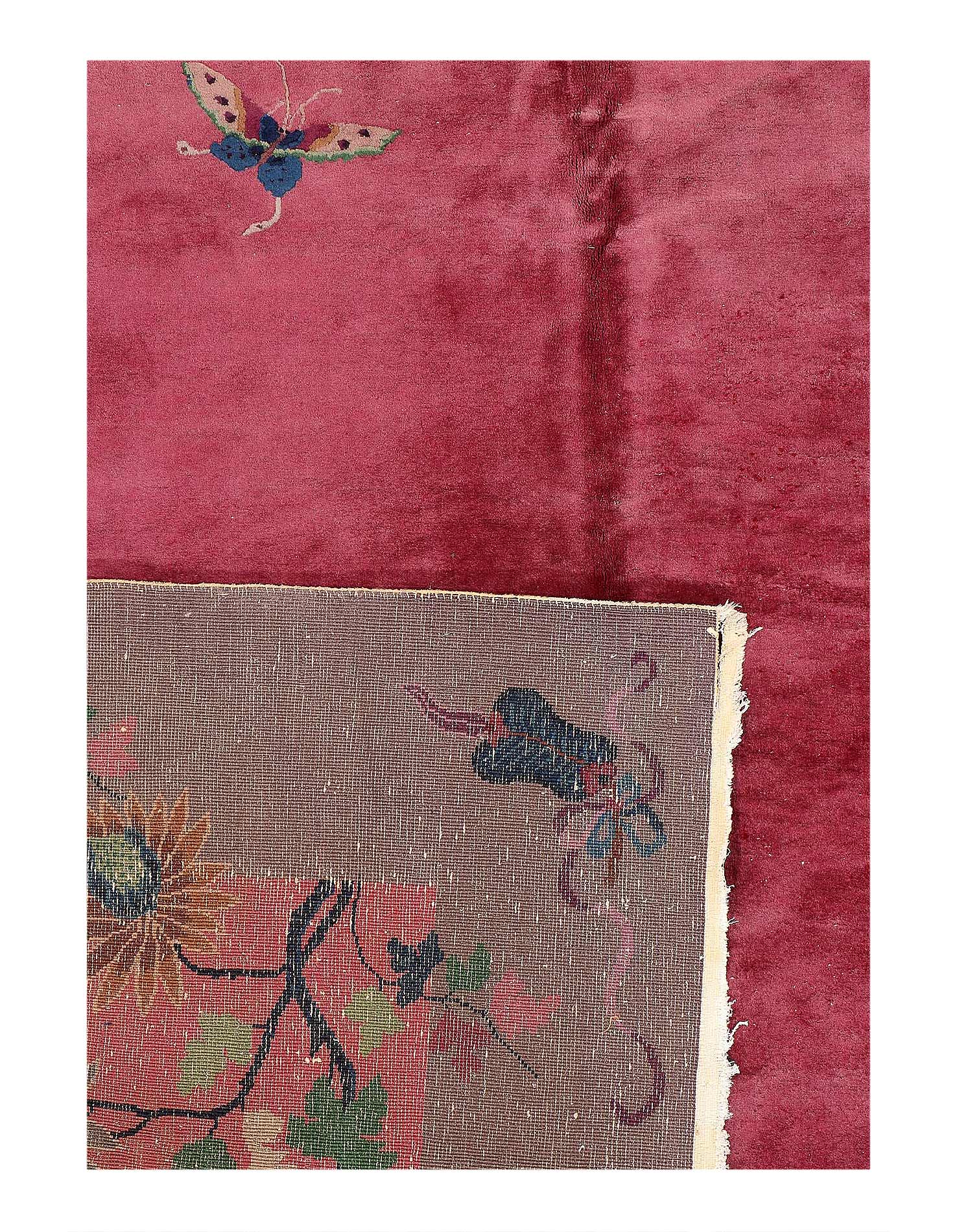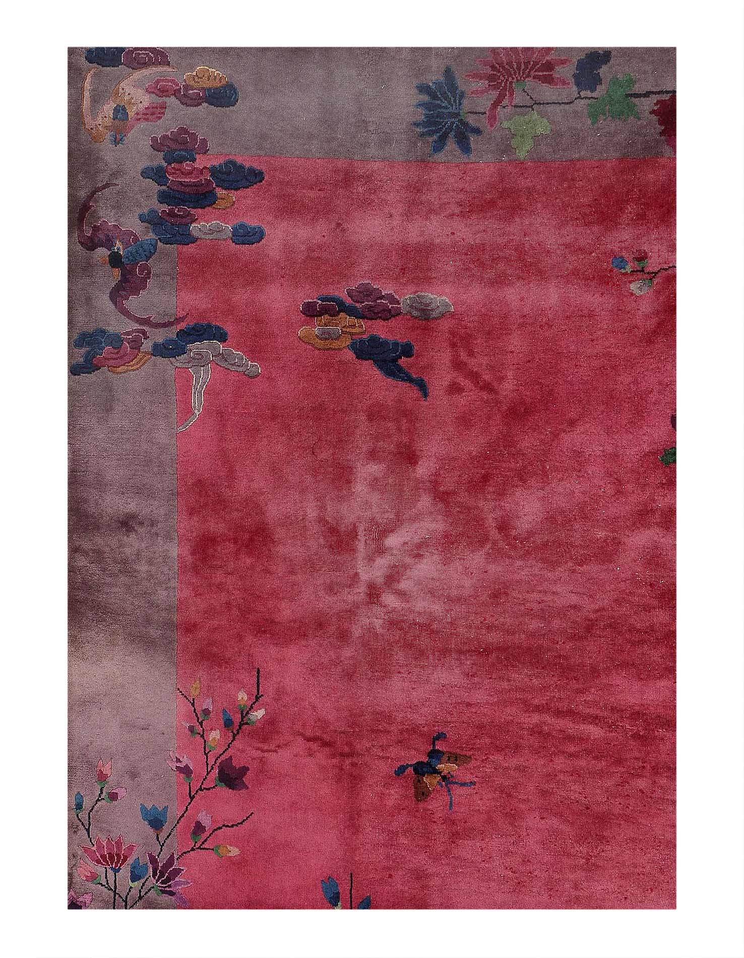 Chinese Deco Rug, Origin: China, Circa: Early 20th Century – Here is an exciting and appealing antique Oriental carpet – an antique Art Deco rug that was designed and woven in China during the early years of the twentieth century. Heavily informed by the aesthetic inclinations of the Art Deco period, this unique carpet is a compelling and thought-provoking example. A scalloped border of Gold encloses a Light Brown / Blue sand field on this exquisitely subtle and restrained antique Chinese Art Deco. At first the field appears empty or open, but it is actually covered by a tone-on-tone design of scrolls and cloud-bands emanating inward from the outer edges. In their sinuous rhythms they echo the scalloped forms of the border and continue its visual effects across the carpet in a more subdued manner. This carpet testifies to the masterful design sensibilities of Chinese weavers as they made the transition into the modern world. The Art Deco movement had an outside influence on the world of art and design, and some of the most important qualities and characteristics of that movement may be found in this fine rug.