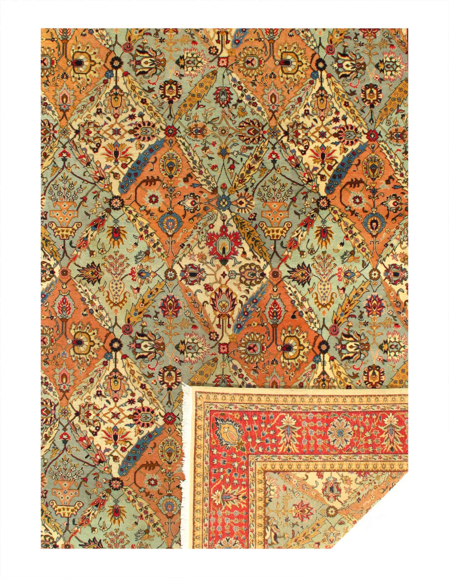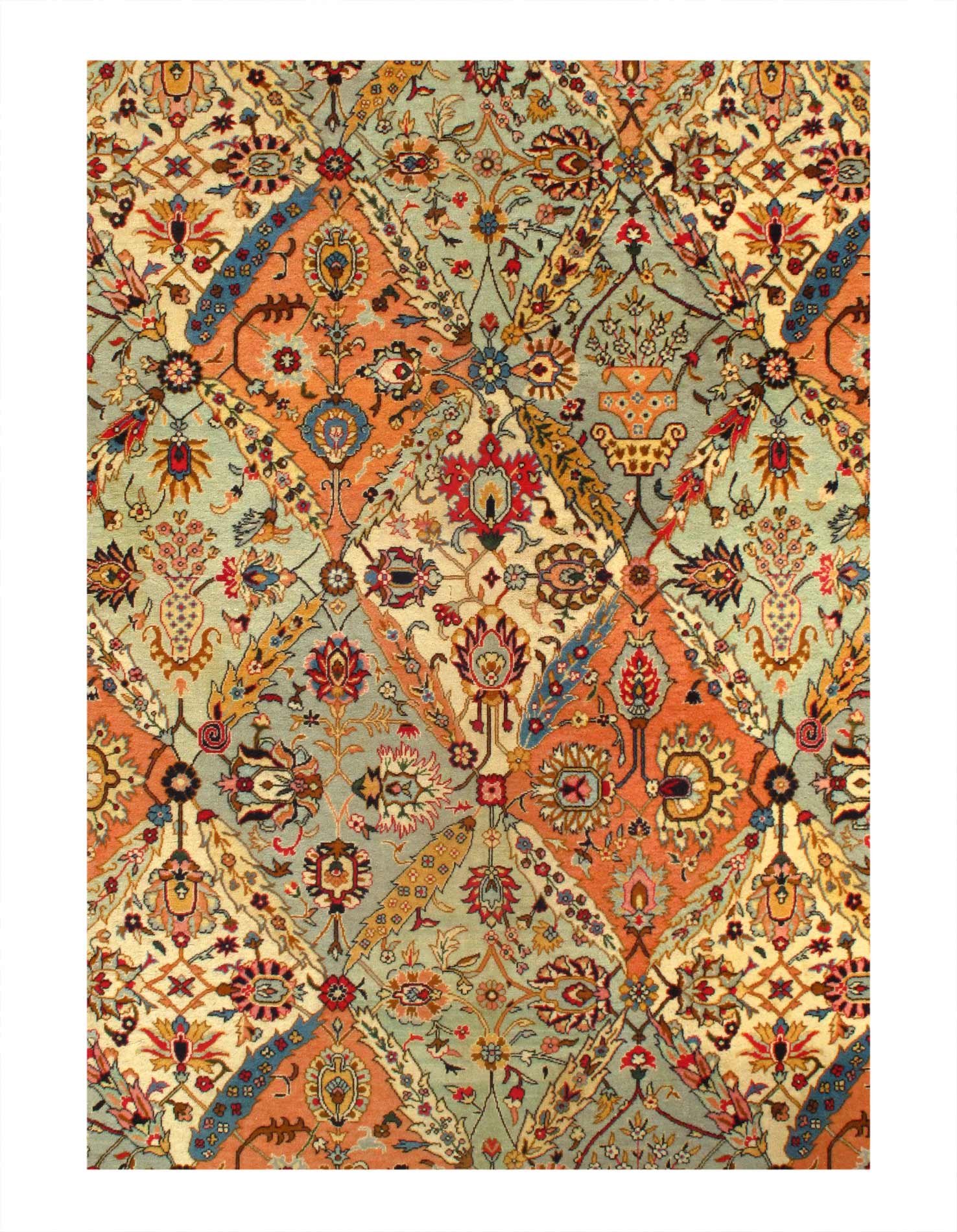 Magnificent Garden Design Room Size Antique Persian Tabriz Rug, Country of Origin / Rug Type: Persian Rug, Circa Date: 1920 – This beautiful antique rug is an excellent example of why Tabriz remained a Persian rug making center that was known for its exquisite artistry for many hundreds of years. This antique Persian Tabriz rug dates back to around the 1920’s and features a beautiful rendition of the iconic garden design. The colorful designs of the antique Persian rug present the viewer with glimpses into little garden scenes, as if they were peering at them through a window.