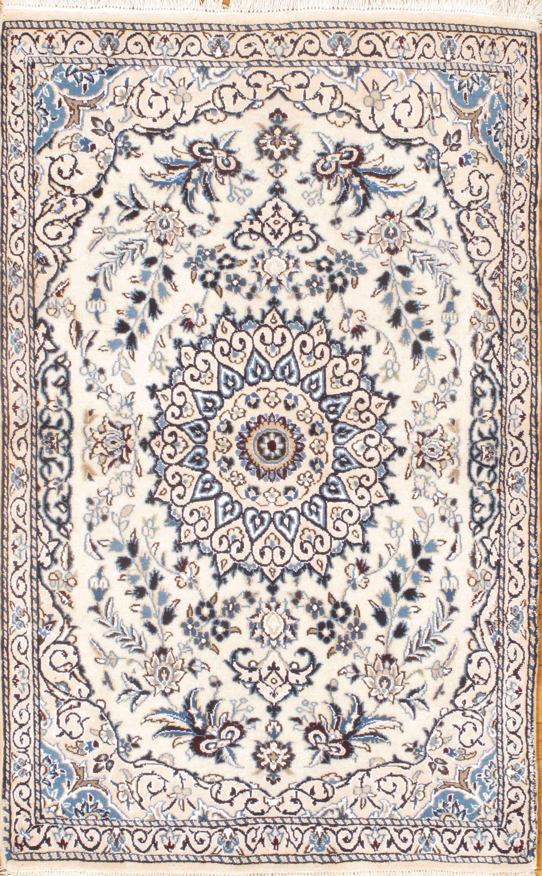 Persian Nain rugs are renowned for their detail and fine use of outlining along the central motifs. Breaking from the classical style of many vintage rugs produced around central Iran, Persian Nain rugs became renowned for their modern appeal and personal style, establishing the classical motifs of many other regional rugs, only through a more precise lens. In this striking piece, the precision is particularly visible along the heart of the vintage Persian rug, where the attention to detail allows each individual color to stand out as a unique part of the whole. The surrounding borders help ground the masterpiece and add horizontal intrigue to the natural elements within, which are arranged vertically to establish a cascading effect.