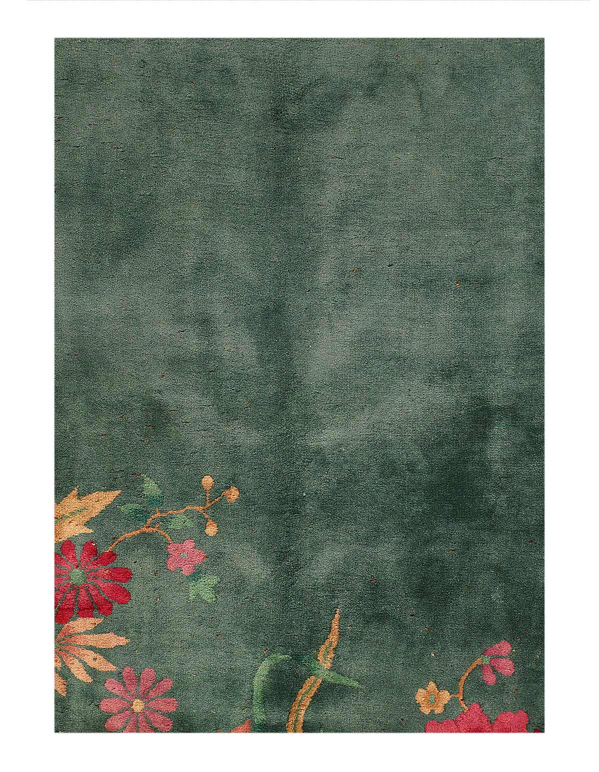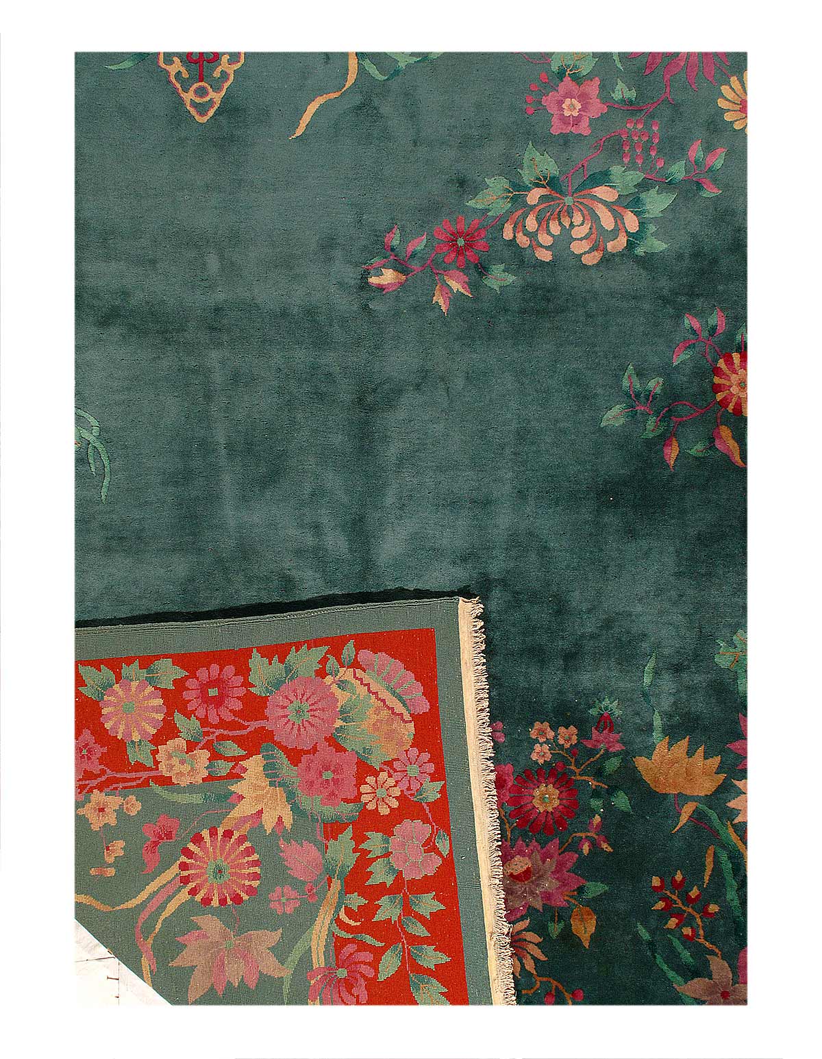 Chinese Deco Rug, Origin: China, Circa: Early 20th Century – Here is an exciting and appealing antique Oriental carpet – an antique Art Deco rug that was designed and woven in China during the early years of the twentieth century. Heavily informed by the aesthetic inclinations of the Art Deco period, this unique carpet is a compelling and thought-provoking example. A scalloped border of Blue enclose Red / Navy sand field on this exquisitely subtle and restrained antique Chinese Art Deco. At first the field appears empty or open, but it is actually covered by a tone-on-tone design of scrolls and cloud-bands emanating inward from the outer edges. In their sinuous rhythms they echo the scalloped forms of the border and continue its visual effects across the carpet in a more subdued manner. This carpet testifies to the masterful design sensibilities of Chinese weavers as they made the transition into the modern world. The Art Deco movement had an outside influence on the world of art and design, and some of the most important qualities and characteristics of that movement may be found in this fine rug.