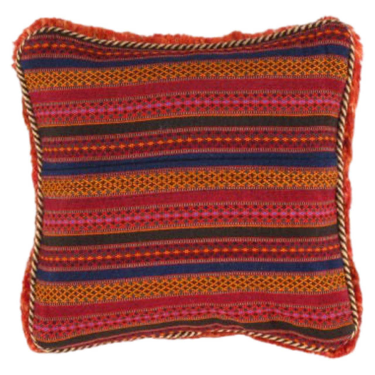 The word “Gabbeh” literally translates to “in the rough,” and it is an accurate description of this style of Persian rug. Gabbeh carpets are woven on makeshift ground looms constructed both of materials that are kept and hauled for long distances by the nomadic tribel, and also of materials that are found at each site where the tribe sets up camp. Due to the fact that part of the loom must be found at each site, a wide variety is introduced. Thus, these rugs are usually somewhat irregular in shape. But, for what they lack in perfectly uniform shape they more than make up for in character, durability and uniqueness.This Gabbeh pillow is made of high-quality LAMBS WOOL The piece was crafted with good workmanship.