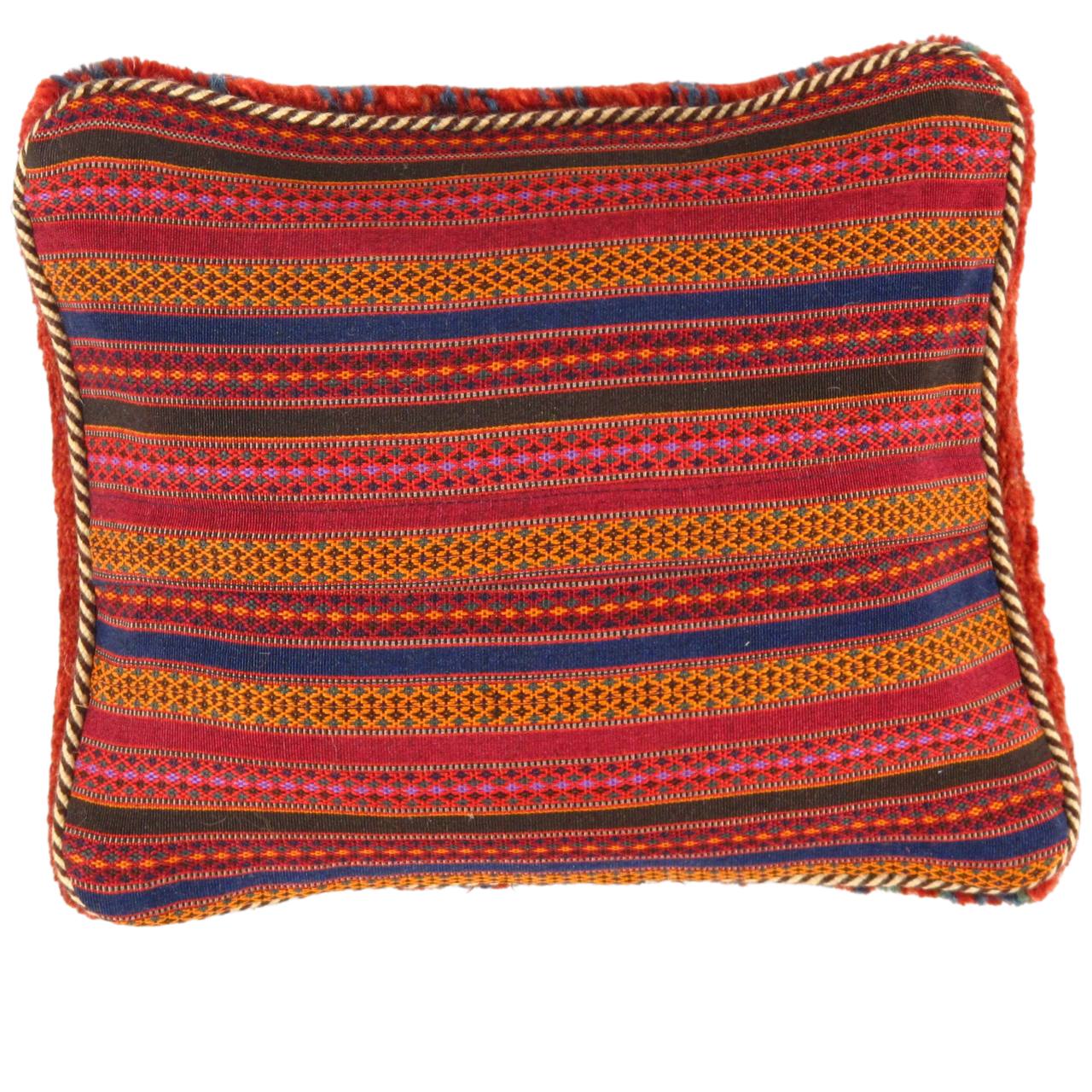 The word “Gabbeh” literally translates to “in the rough,” and it is an accurate description of this style of Persian rug. Gabbeh carpets are woven on makeshift ground looms constructed both of materials that are kept and hauled for long distances by the nomadic tribel, and also of materials that are found at each site where the tribe sets up camp. Due to the fact that part of the loom must be found at each site, a wide variety is introduced. Thus, these rugs are usually somewhat irregular in shape. But, for what they lack in perfectly uniform shape they more than make up for in character, durability and uniqueness.This Gabbeh pillow is made of high-quality LAMBS WOOL The piece was crafted with good workmanship.