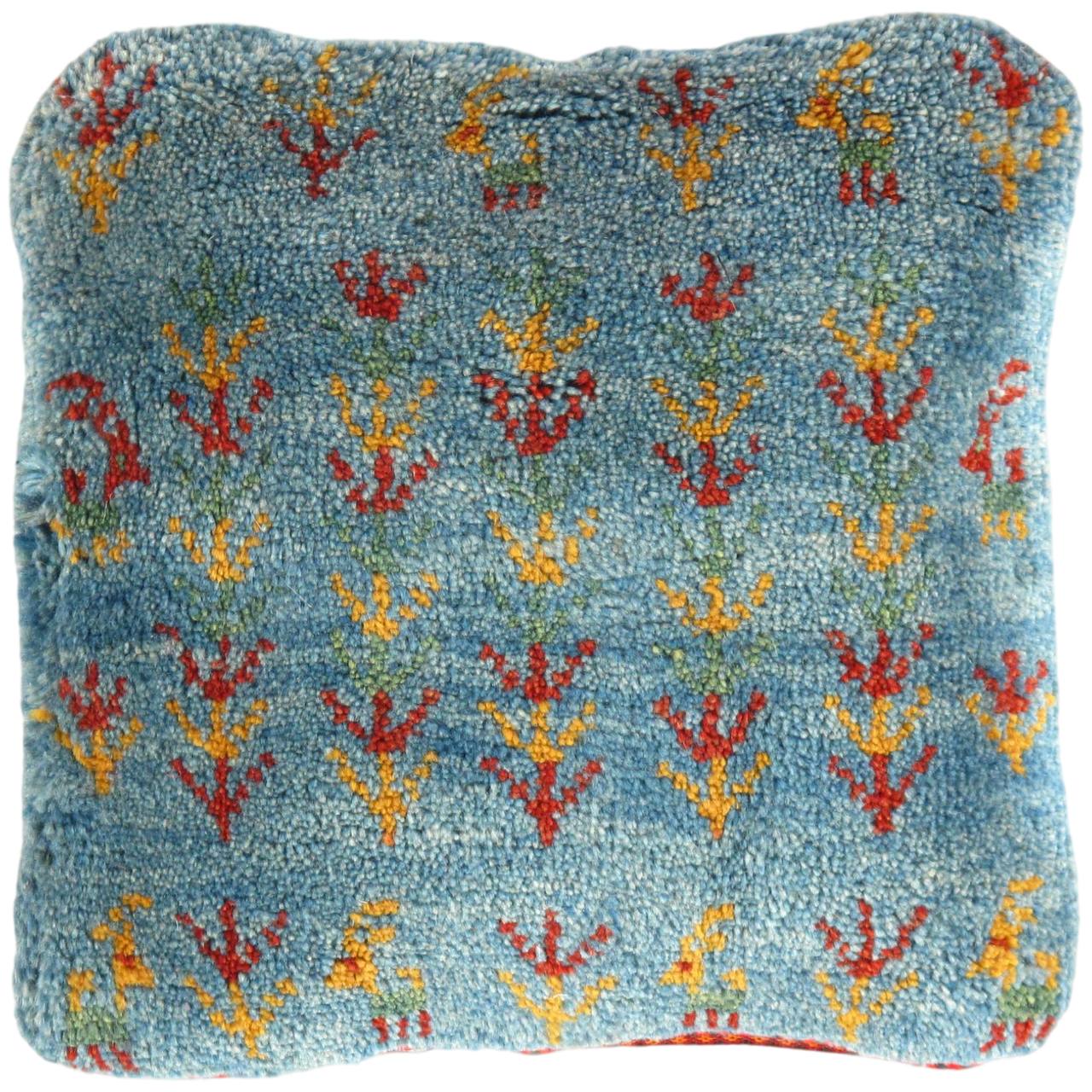 The word “Gabbeh” literally translates to “in the rough,” and it is an accurate description of this style of Persian rug. Gabbeh carpets are woven on makeshift ground looms constructed both of materials that are kept and hauled for long distances by the nomadic tribel, and also of materials that are found at each site where the tribe sets up camp. Due to the fact that part of the loom must be found at each site, a wide variety is introduced. Thus, these rugs are usually somewhat irregular in shape. But, for what they lack in perfectly uniform shape they more than make up for in character, durability and uniqueness.This Gabbeh pillow is made of high-quality LAMBS WOOL The piece was crafted with good workmanship.