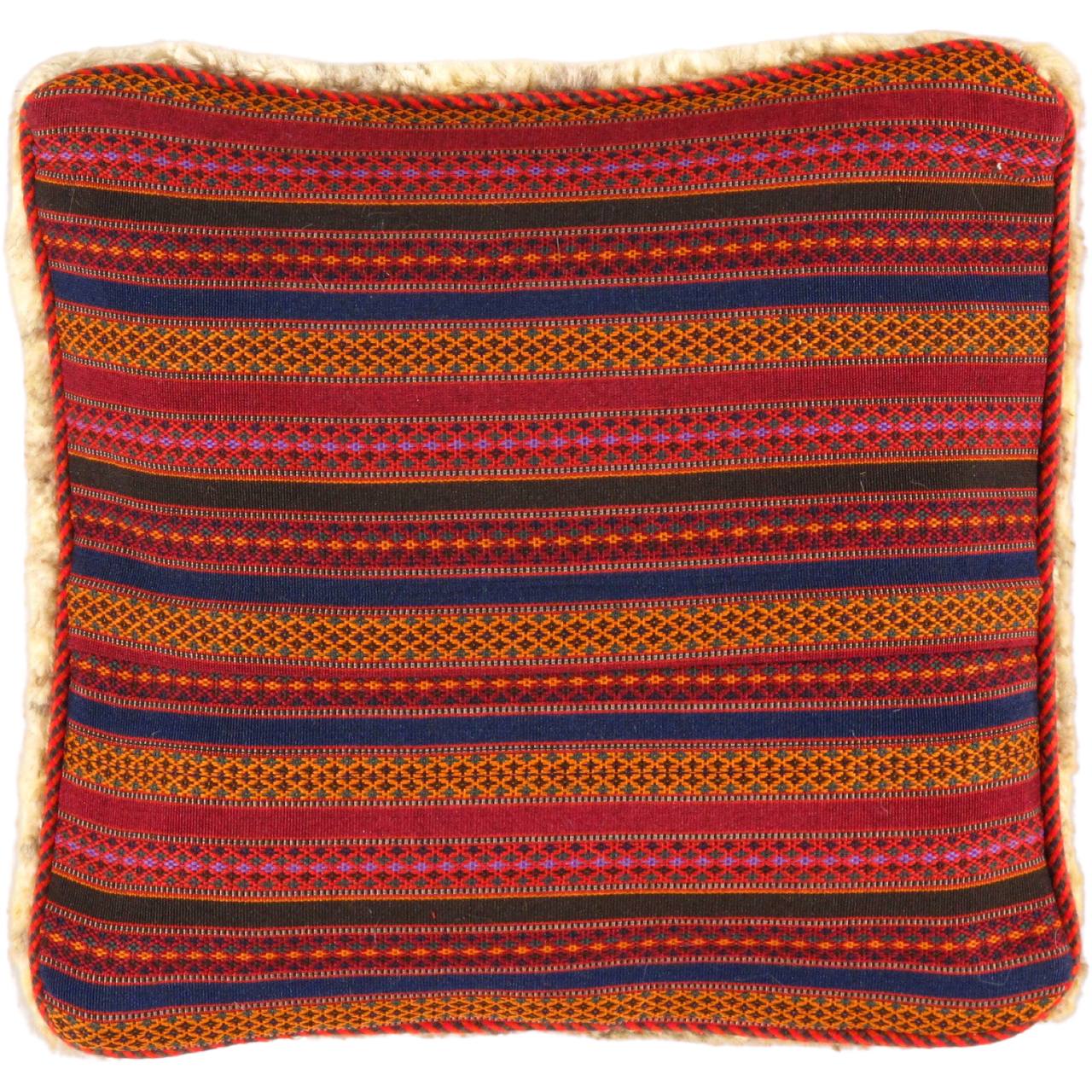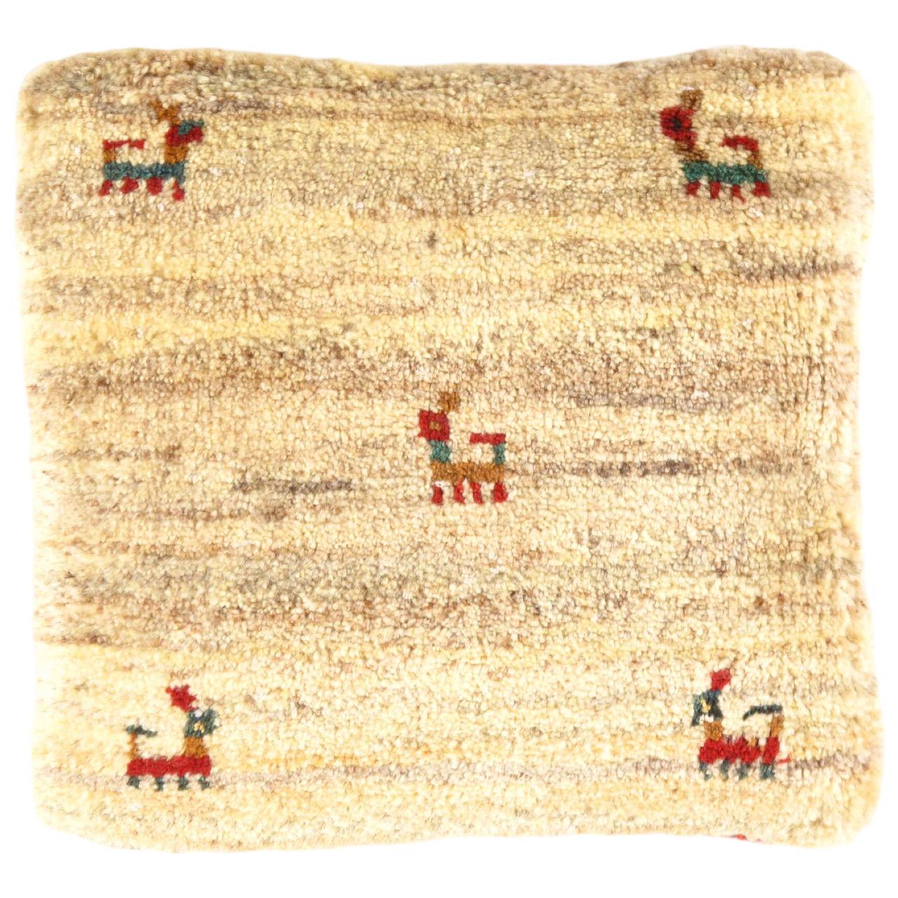 The word “Gabbeh” literally translates to “in the rough,” and it is an accurate description of this style of Persian rug. Gabbeh carpets are woven on makeshift ground looms constructed both of materials that are kept and hauled for long distances by the nomadic tribel, and also of materials that are found at each site where the tribe sets up camp. Due to the fact that part of the loom must be found at each site, a wide variety is introduced. Thus, these rugs are usually somewhat irregular in shape. But, for what they lack in perfectly uniform shape they more than make up for in character, durability and uniqueness.This Gabbeh pillow is made of high-quality LAMBS WOOL The piece was crafted with good workmanship.