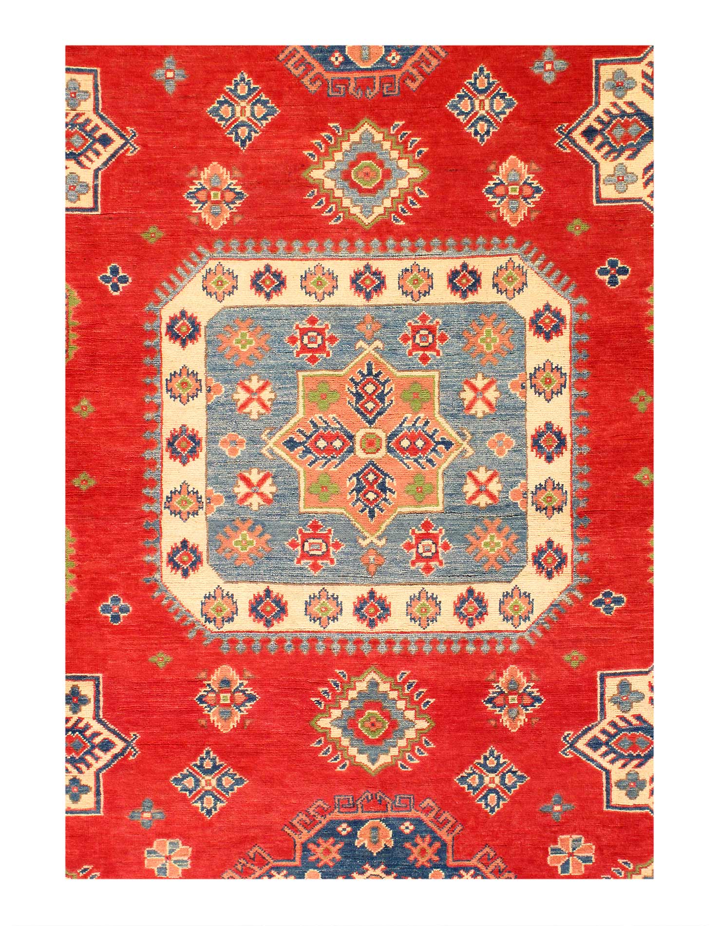Original Super Kazak Rug. Handmade Hand-knotted,Very Practical for High Traffic,Hand-Spun Lamb's Wool on a Cotton Foundation,Vegetable Dyed,This rug is handmade from 100-percent premium, hand-spun wool, and employ ancient pot-dying techniques to give them their authentic look.Kazak is a modern shape of old Caucasian rugs which strictly adheres to traditional design elements of the Caucasus. It has elements such as the stepped hooked polygons, geometrical medallions and rosettes, presented in more stylized manner and with a new dimension. Natural dyes produce soft luminous shades and abrashes causing a beautiful sheen. Hand spun wool yarn is normally used in the variety of vibrant warm colors. Kazaks rugs in our collection are all fine quality pieces from Pakistan made with Ghazni hand spun wool and natural dyes