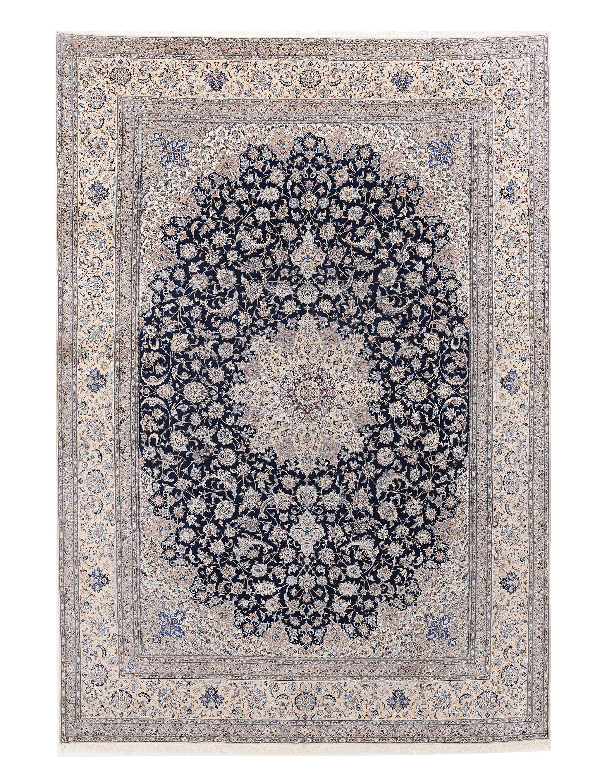 Persian Nain rugs are renowned for their detail and fine use of outlining along the central motifs. Breaking from the classical style of many vintage rugs produced around central Iran, Persian Nain rugs became renowned for their modern appeal and personal style, establishing the classical motifs of many other regional rugs, only through a more precise lens. In this striking piece, the precision is particularly visible along the heart of the vintage Persian rug, where the attention to detail allows each individual color to stand out as a unique part of the whole. The surrounding borders help ground the masterpiece and add horizontal intrigue to the natural elements within, which are arranged vertically to establish a cascading effect.