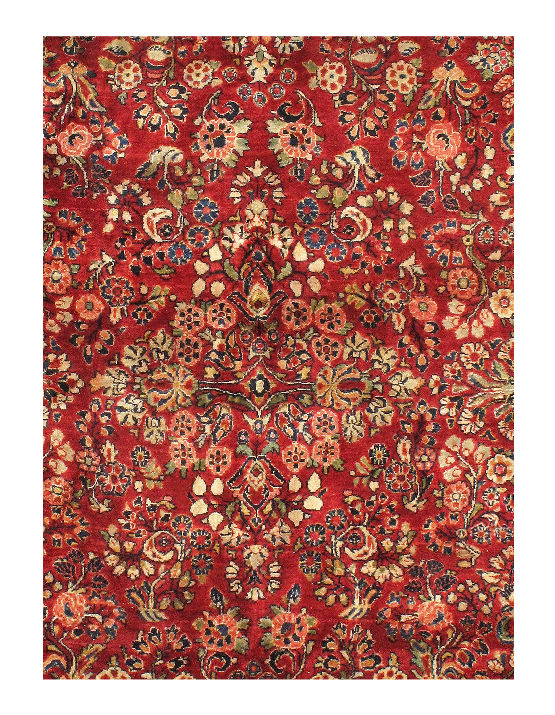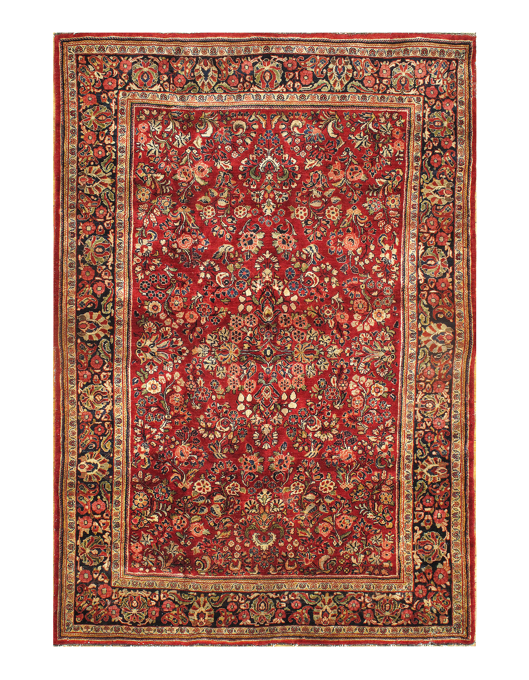 Palmettes, flowers, and sinuous vines wend their way in profusion across the rich red field of this luscious antique Sarouk. The design is carefully controlled in its layout and symmetry despite its dynamic freedom and exuberance. The field elements reappear in the main border as a continuous vinescroll, but set against a blue ground in framing contrast to the field. The meticulous drawing and uniform design texture create a harmonious decorative effect despite the richness of the color and complexity of the ornament.