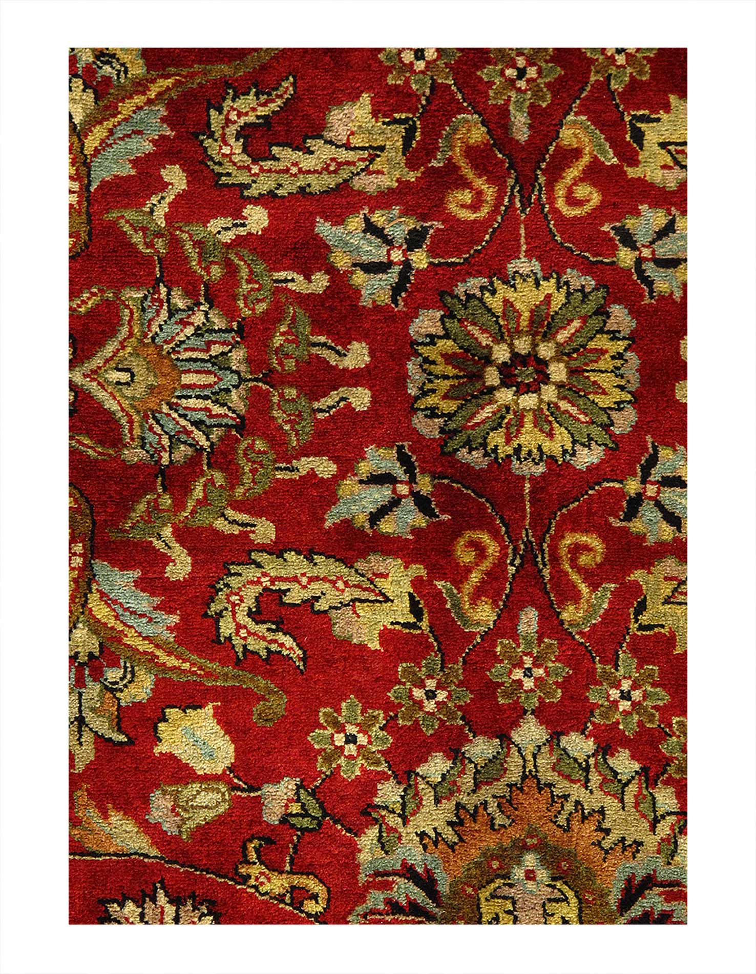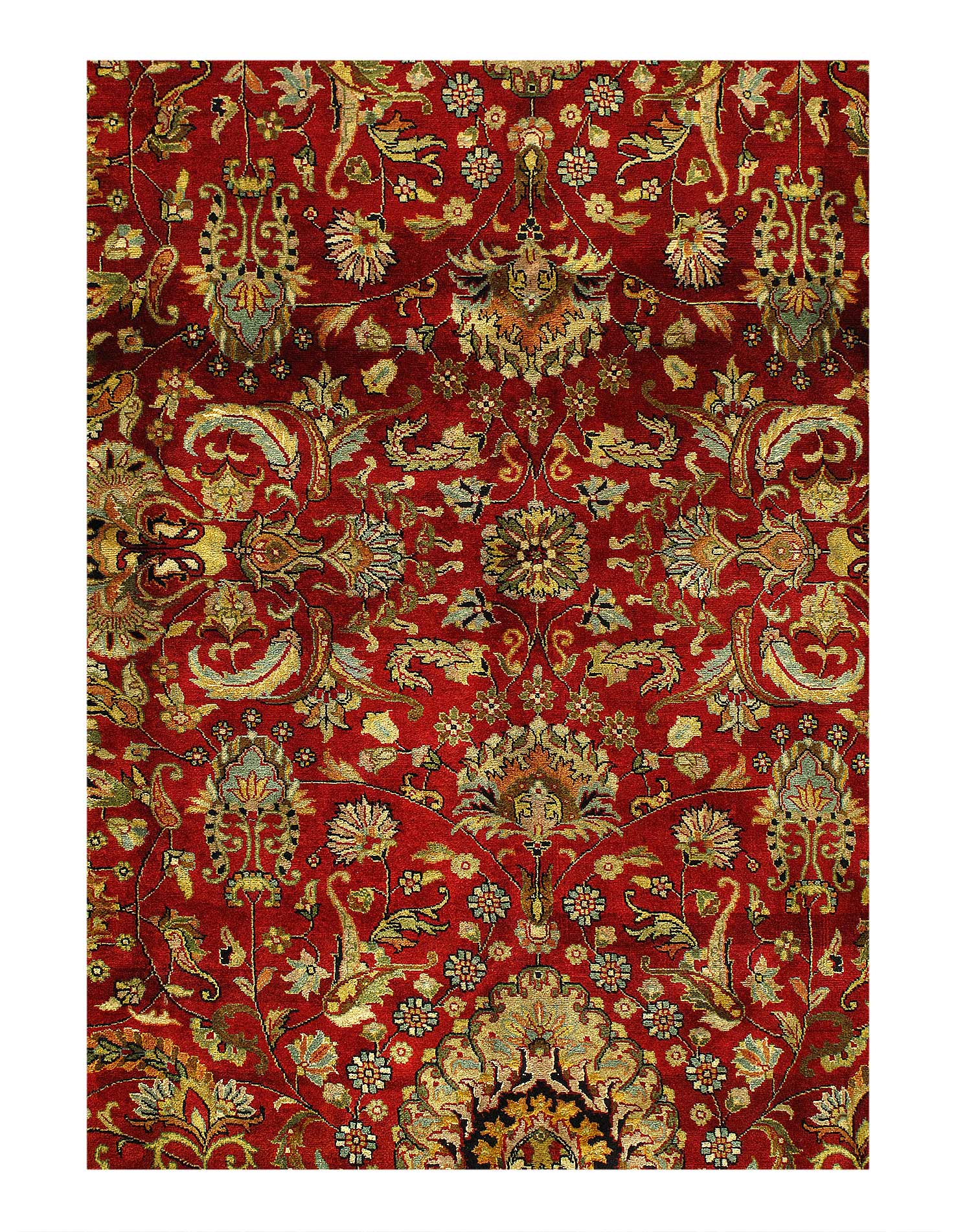Augra rugs are distinguished by their excellent weave, they have the most diverse display of designs which often reflect scenes of falconry, and ferocious lions. Some of the most well know Augra rugs were inspired by hand painted covers of Ancient books. The dominant colors for these rugs tend to be, cream, red, navy blue, and many more. Their material is often woven with wool or silk. Augra rugs are not only one of the finest groups of Indian rugs but also the most decorative as well.